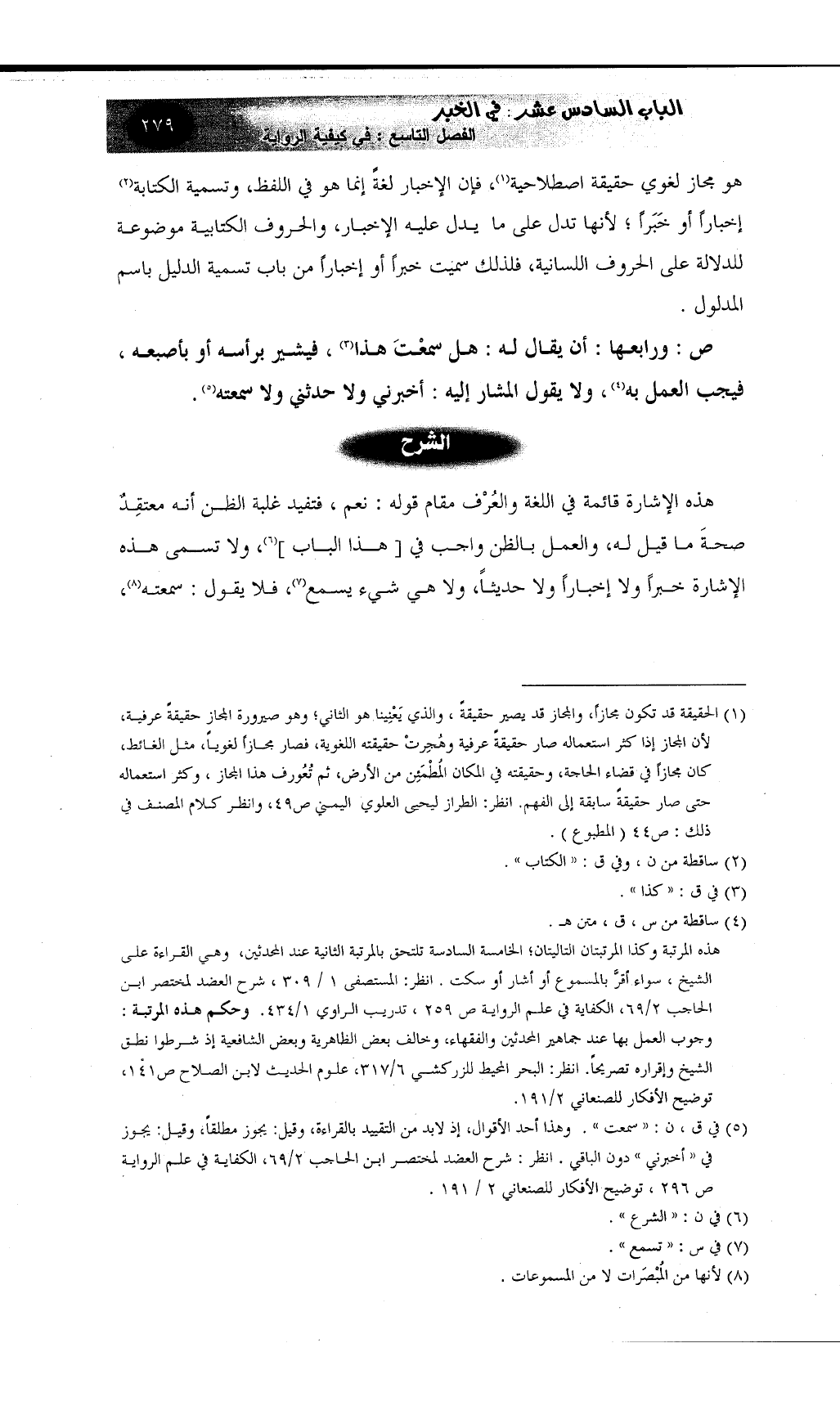 هذه المرتبة وكذا المرتبتان التاليتان؛ الخامسة السادسة تلتحق بالمرتبة الثانية عند المحدثين، وهي القراءة على الشيخ، سواء أقرَّ بالمسموع أو أشار أو سكت انظر: المستصفى 1 / 309، شرح العضد لمختصر ابن الحاجب 2/69، الكفاية في علم الرواية ص 259، تدريب الراوي 1/434. وحكم هذه المرتبة: وجوب العمل بها عند جماهير المحدثين والفقهاء، وخالف بعض الظاهرية وبعض الشافعية إذ شرطوا نطق الشيخ وإقراره تصريحاً. انظر: البحر المحيط للزركشي 6/317، علوم الحديث لابن الصلاح ص141، توضيح الأفكار للصنعاني 2/191.
