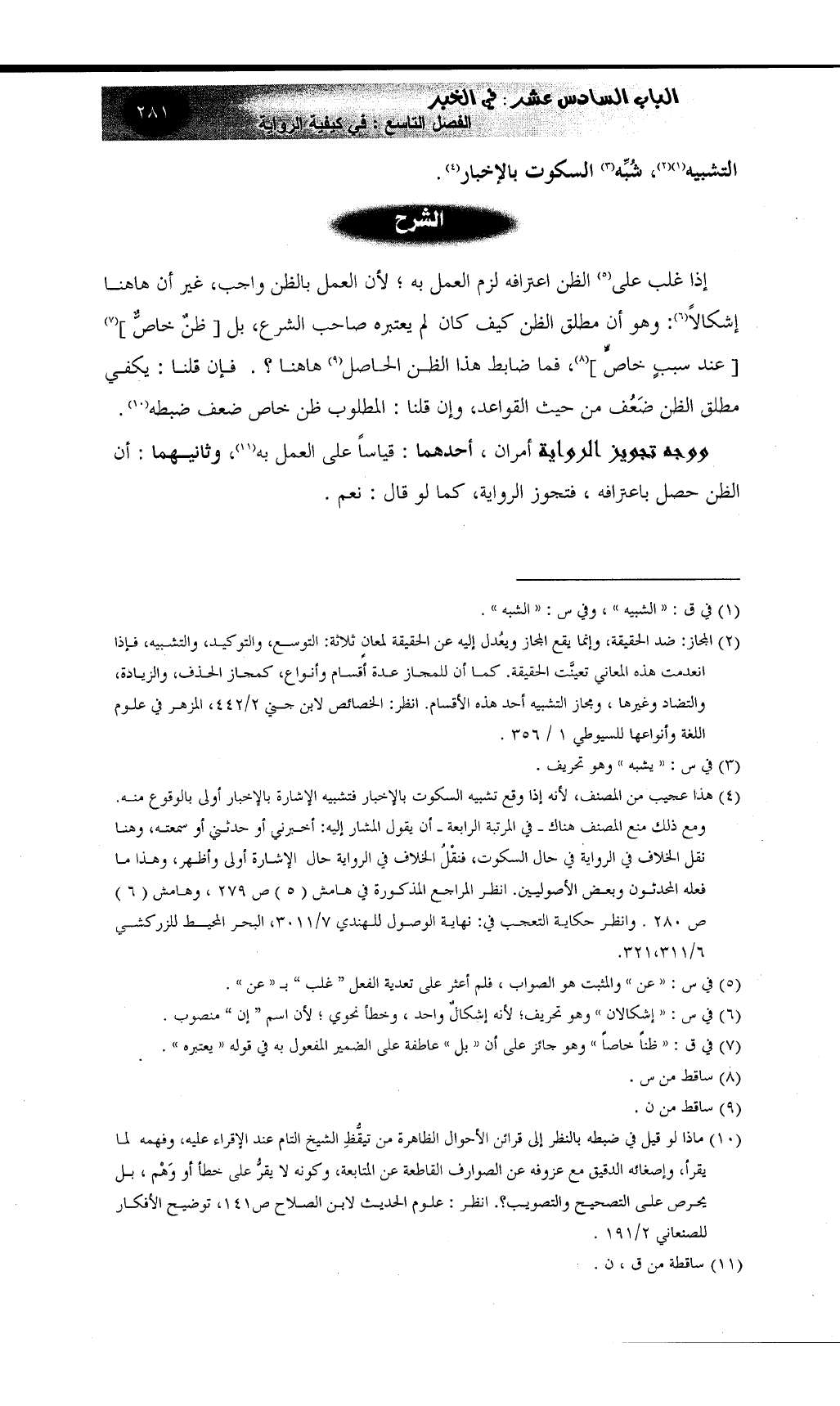 (¬4) هذا عجيب من المصنف، لأنه إذا وقع تشبيه السكوت بالإخبار فتشبيه الإشارة بالإخبار أولى بالوقوع منه. ومع ذلك منع المصنف هناك ـ في المرتبة الرابعة ـ أن يقول المشار إليه: أخبرني أو حدثني أو سمعته، وهنا نقل الخلاف في الرواية في حال السكوت، فنقْلُ الخلاف في الرواية حال الإشارة أولى وأظهر، وهذا ما فعله المحدثون وبعض الأصوليين. انظر المراجع المذكورة في هامش (5) ص 279، وهامش (6) ص 280. وانظر حكاية التعجب في: نهاية الوصول للهندي 7/3011، البحر المحيط للزركشي 6/311، 321.