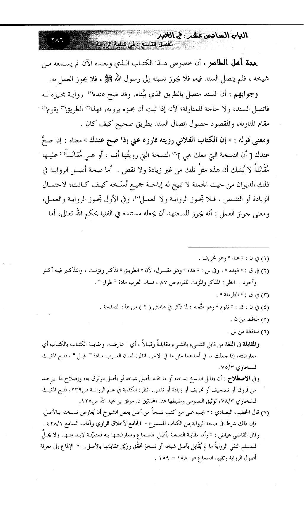 (¬7) قال الخطيب البغدادي: ((يجب على من كتب نسخةً من أصل بعض الشيوخ أن يُعارض نسخته بالأصل. فإن ذلك شرط في صحة الرواية من الكتاب المسموع)) الجامع لأخلاق الراوي وآداب السامع 1/428.