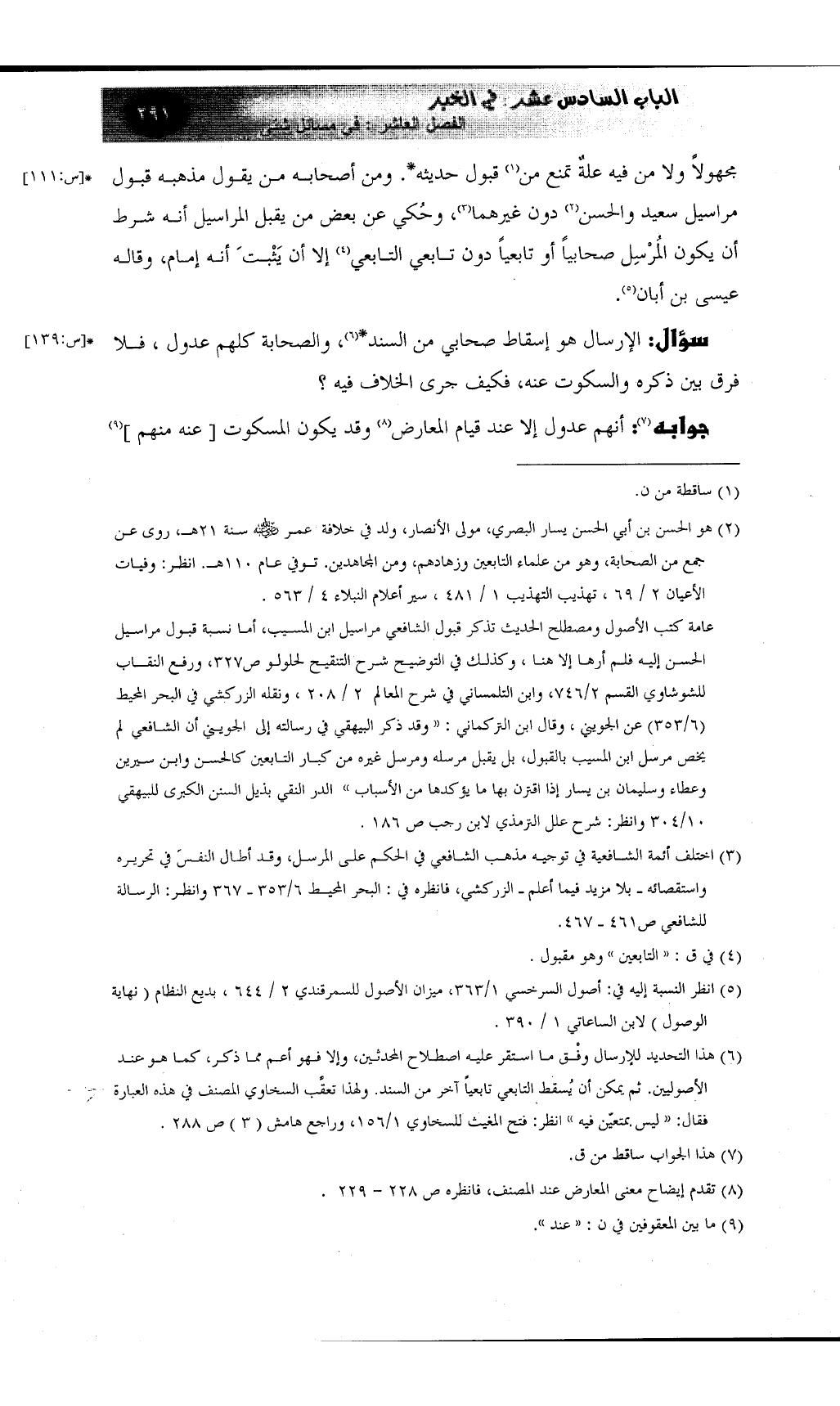 (¬6) هذا التحديد للإرسال وفْق ما استقر عليه اصطلاح المحدثين، وإلا فهو أعم مما ذكر، كما هو عند الأصوليين. ثم يمكن أن يُسقْط التابعي تابعياً آخر من السند. ولهذا تعقَّب السخاوي المصنف في هذه العبارة فقال: ((ليس بمتعيّن فيه)) انظر: فتح المغيث للسخاوي 1/156، وراجع هامش (3) ص 288.