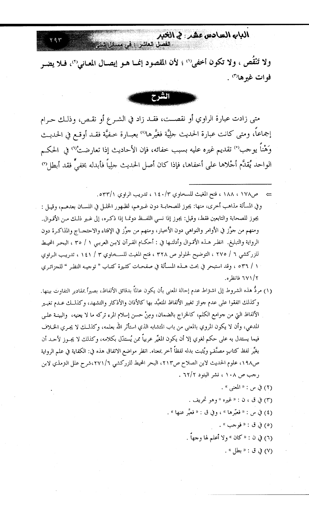 متى زادت عبارة الراوي أو نقصت، فقد زاد في الشرع أو نقص، وذلك حرام إجماعاً، ومتى كانت عبارة الحديث جلِيَّة فغيَّرها (¬4) بعبارة خفية فقد أوقع في الحديث وَهْناً يوجب (¬5) تقديم غيره عليه بسبب خفائه، فإن الأحاديث إذا تعارضتْ (¬6) في الحكم الواحد يُقدَّم أجْلاها على أخفاها، فإذا كان أصل الحديث جلِياً فأبدله بخفيٍّ فقد أبطل (¬7)