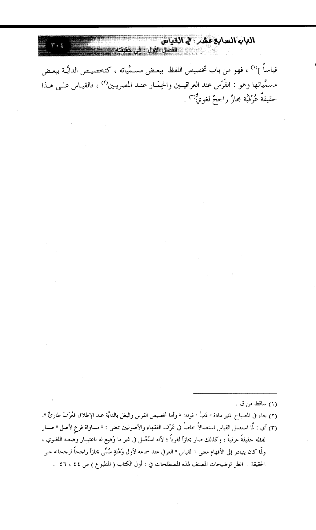قياساً] (¬1) ، فهو من باب تخصيص اللفظ ببعض مسمَّياته، كتخصيص الدابَّة ببعض مسمَّياتها وهو: الفَرَس عند العراقيين والحِمَار عند المصريين (¬2) ، فالقياس على هذا حقيقةٌ عُرْفيَّة مجازٌ راجحٌ لغويٌّ (¬3) .