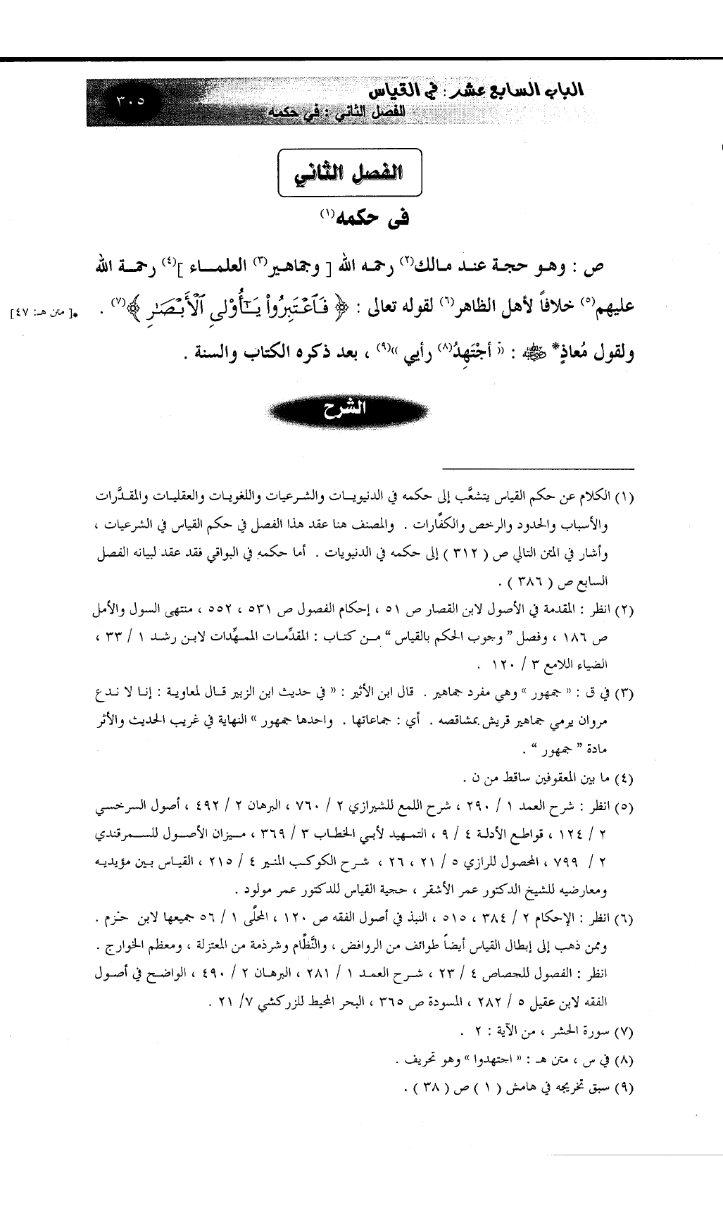 (¬1) الكلام عن حكم القياس يتشعَّب إلى حكمه في الدنيويات والشرعيات واللغويات والعقليات والمقدَّرات والأسباب والحدود والرخص والكفَّارات. والمصنف هنا عقد هذا الفصل في حكم القياس في الشرعيات، وأشار في المتن التالي ص (312) إلى حكمه في الدنيويات. أما حكمه في البواقي فقد عقد لبيانه الفصل السابع ص (386) .