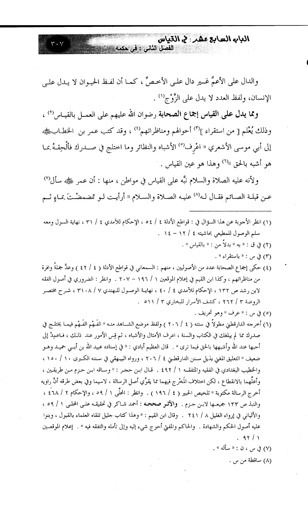 (¬6) أخرجه الدارقطني مطولاً في سننه (4 / 206) ولفظ موضع الشاهد منه ((الفَهْم الفَهْم فيما يختلج في صدرك مما لم يبلغك في الكتاب والسنة، اعرف الأمثال والأشباه، ثم قِس الأمور عند ذلك، فاعمِدْ إلى أحبها عند الله وأشبهها بالحق فيما ترى)) . قال العظيم أبادي: ((في إسناده عبيد الله بن أبي حميد وهو ضعيف)) التعليق المغني بذيل سنن الدارقطني 4 / 206، ورواه البيهقي في سننه الكبرى 10 / 150، والخطيب البغدادي في الفقيه والمتفقه 1 / 492. قال ابن حجر: ((وساقه ابن حزم من طريقين، وأعلَّهما بالانقطاع، لكن اختلاف المَخْرج فيهما مما يقوِّي أصل الرسالة، لاسيما وفي بعض طرقه أنَّ راويه أخرج الرسالة مكتوبة)) تلخيص الحبير (4 / 196) . وانظر: المحلَّى 1 / 59، والإحكام 2 / 468، والنبذ ص 133 جميعها لابن حزم. والأثر صححه: أحمد شاكر في تحقيقه على المحلى 1 / 59، والألباني في إرواء الغليل 8 / 241. وقال ابن القيم: ((وهذا كتاب جليل تلقاه العلماء بالقبول، وبنوا عليه أصول الحكم والشهادة..والحاكم والمفتي أحوج شيء إليه وإلى تأمله والتفقه فيه)) . إعلام الموقعين 1 / 92.