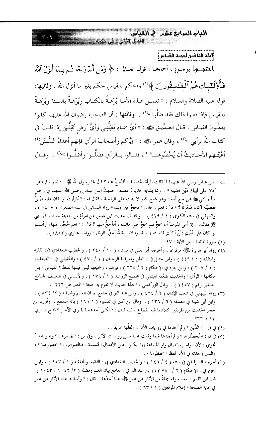 (¬2) رواه أبو هريرة رضي الله عنه مرفوعاً، وأخرجه أبو يعلى في مسنده (10 / 240) ، والخطيب البغدادي في: الفقيه والمتفقه (1 / 449) ، وابن حنبل في: العلل ومعرفة الرجال (1 / 470) ، والعُقيلي في: الضعفاء (1 / 207) ، وابن حزم في الإحكام (2 / 225) وغيرهم، وجميعها ليس فيها لفظ ((القياس)) بل مكانها ((الرأي)) والحديث ضعَّفه الهيثمي في مجمع الزوائد (1 / 179) ، والألباني في ضعيف الجامع الصغير برقم (2457) . وقال الزركشي: ((هذا حديث لا تقوم به حجة)) المعتبر ص 226.