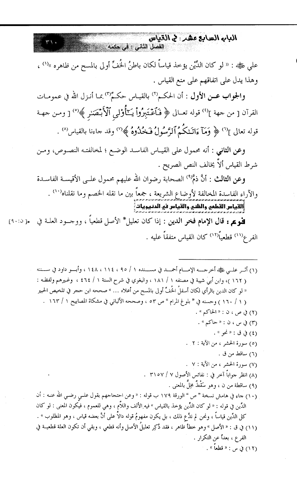 (¬10) جاء في هامش نسخة " ص " الورقة 179 ب قوله: ((وعن احتجاجهم بقول عليٍ رضي الله عنه: أن الدِّين في قوله: ((لو كان الدِّين يؤخذ بالقياس)) فيه الألف واللاَّم، وهي للعموم، فيكون المعنى: لو كان كل الدِّين قياساً، ونحن لم ندَّعِ ذلك، بل يكون مفهومُ قوله دالاًّ على أنَّ بعضه قياس، وهو المطلوب)) .