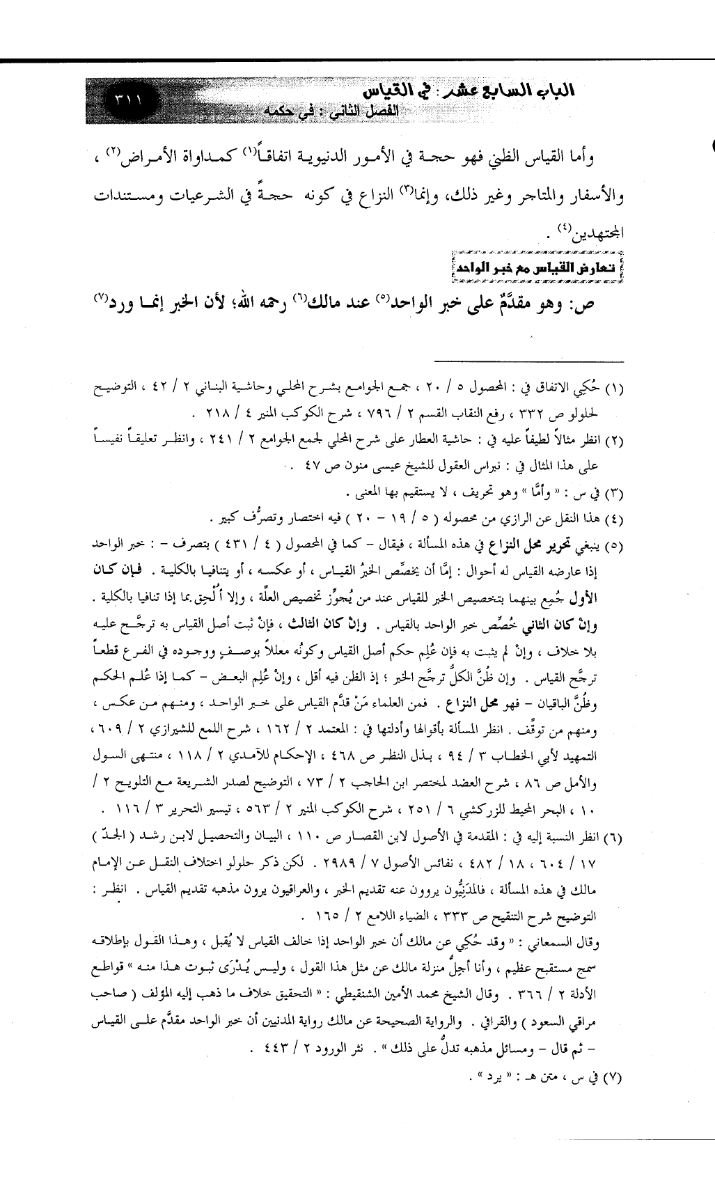 (¬5) ينبغي تحرير محل النزاع في هذه المسألة، فيقال - كما في المحصول (4 / 431) بتصرف -: خبر الواحد إذا عارضه القياس له أحوال: إمَّا أن يخصِّص الخبرُ القياس، أو عكسه، أو يتنافيا بالكلية. فإن كان الأول جُمِع بينهما بتخصيص الخبر للقياس عند من يُجوِّز تخصيص العلَّة، وإلا أُلْحِق بما إذا تنافيا بالكلية. وإنْ كان الثاني خُصِّص خبر الواحد بالقياس. وإنْ كان الثالث، فإنْ ثبت أصل القياس به ترجَّح عليه بلا خلاف، وإنْ لم يثبت به فإن عُلِم حكم أصل القياس وكونُه معللاً بوصفٍ ووجوده في الفرع قطعاً ترجَّح القياس. وإن ظُنَّ الكلُّ ترجَّح الخبر؛ إذ الظن فيه أقل، وإنْ عُلِم البعض - كما إذا عُلم الحكم وظُنَّ الباقيان - فهو محل النزاع. فمن العلماء مَنْ قدَّم القياس على خبر الواحد، ومنهم من عكس، ومنهم من توقَّف. انظر المسألة بأقوالها وأدلتها في: المعتمد 2 / 162، شرح اللمع للشيرازي 2 / 609، التمهيد لأبي الخطاب 3 / 94، بذل النظر ص 468، الإحكام للآمدي 2 / 118، منتهى السول والأمل ص 86، شرح العضد لمختصر ابن الحاجب 2 / 73، التوضيح لصدر الشريعة مع التلويح 2 / 10، البحر المحيط للزركشي 6 / 251، شرح الكوكب المنير 2 / 563، تيسير التحرير 3 / 116.