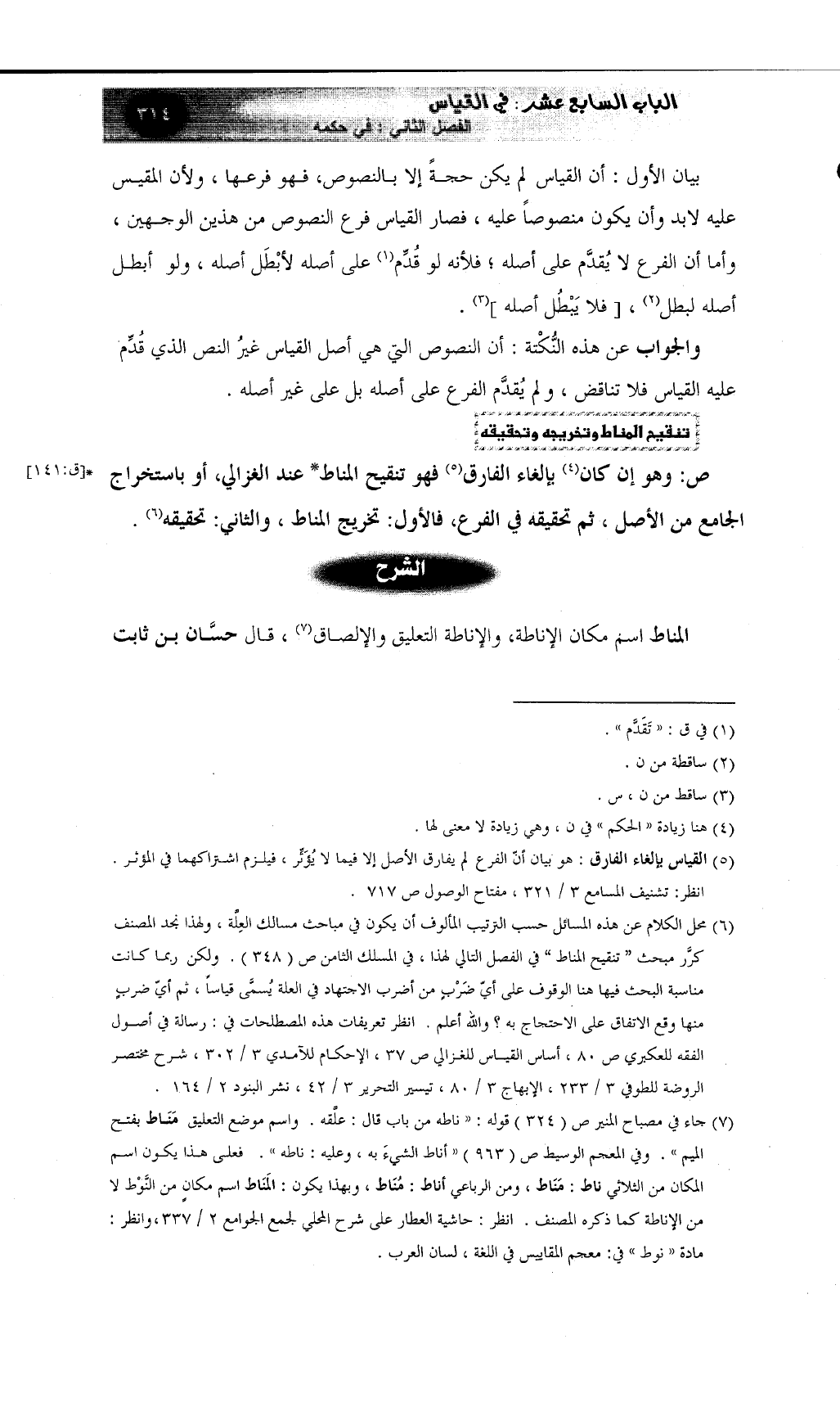 (¬6) محل الكلام عن هذه المسائل حسب الترتيب المألوف أن يكون في مباحث مسالك العِلَّة، ولهذا نجد المصنف كرَّر مبحث " تنقيح المناط " في الفصل التالي لهذا، في المسلك الثامن ص (348) . ولكن ربما كانت مناسبة البحث فيها هنا الوقوف على أيّ ضَرْبٍ من أضرب الاجتهاد في العلة يُسمَّى قياساً، ثم أيّ ضربٍ منها وقع الاتفاق على الاحتجاج به؟ والله أعلم. انظر تعريفات هذه المصطلحات في: رسالة في أصول الفقه للعكبري ص 80، أساس القياس للغزالي ص 37، الإحكام للآمدي 3 / 302، شرح مختصر الروضة للطوفي 3 / 233، الإبهاج 3 / 80، تيسير التحرير 3 / 42، نشر البنود 2 / 164.