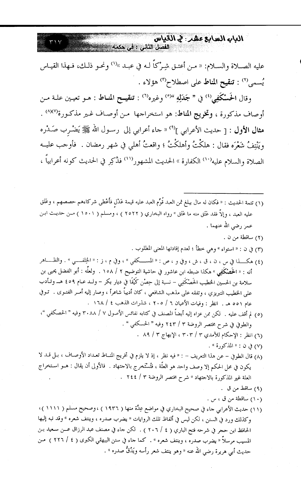 وقال الحَسْكَفِي (¬4) في " جَدَلِهِ " (¬5) وغيره (¬6) : تنقيح المناط: هو تعيين علة من أوصاف مذكورة، وتخريج المناط: هو استخراجها من أوصاف غير مذكورة (¬7) (¬8) . مثال الأول: [حديث الأعرابي] (¬9) ((جاء أعرابي إلى رسول الله صلى الله عليه وسلم يَضْرِب صَدْره ويَنْتِفُ شَعْرَه فقال: هلكْتُ وأهلكْتُ؛ واقعتُ أهلي في شهر رمضان. فأوجب عليه الصلاة والسلام عليه (¬10) الكفارة)) الحديث المشهور (¬11)