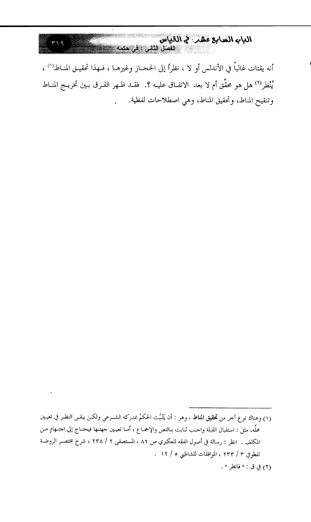 (¬1) وهناك نوع آخر من تحقيق المناط، وهو: أن يَثْبُت الحكمُ بمدركه الشرعي ولكن يبقى النظر في تعيين محلِّه، مثل: استقبال القبلة واجب ثابت بالنص والإجماع، أما تعيين جهتها فيحتاج إلى اجتهادٍ من
