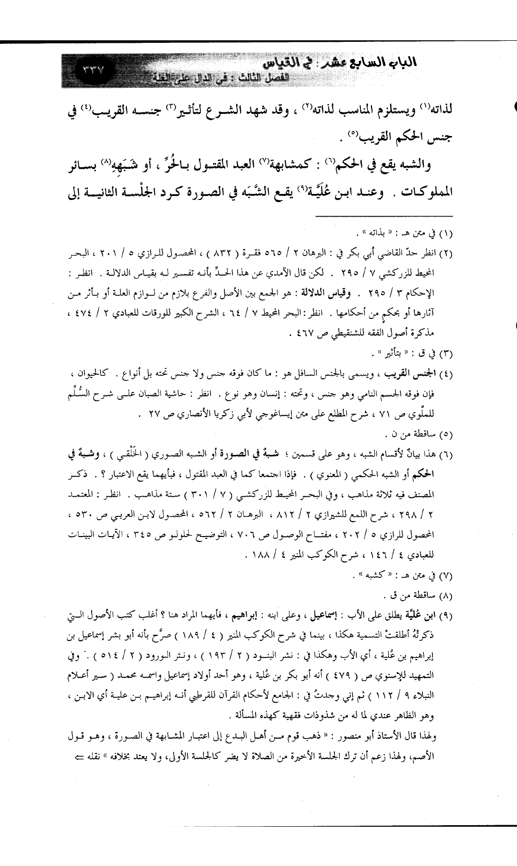 كمشابهة (¬7) العبد المقتول بالحُرِّ، أو شَبَهِهِ (¬8) بسائر المملوكات. وعند ابن عُلَيَّة (¬9) يقع الشَّبَه في الصورة كرد الجلْسة الثانية إلى