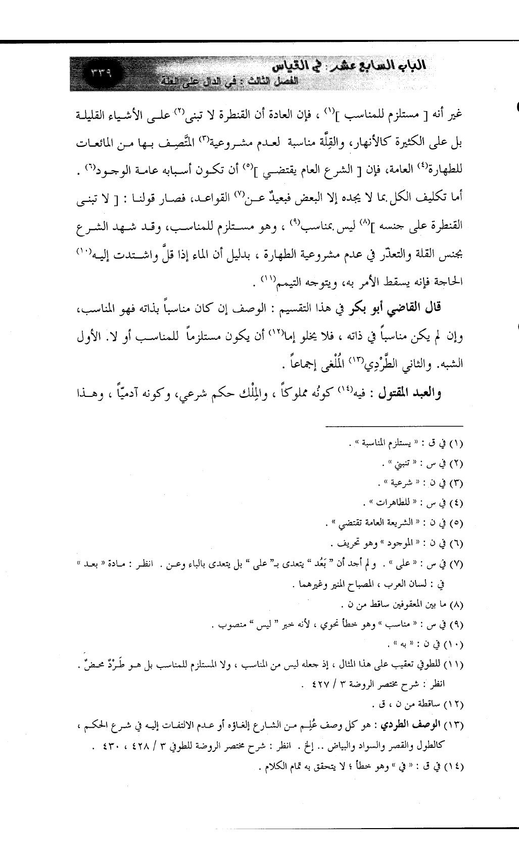 (¬13) الوصف الطردي: هو كل وصف عُلِم من الشارع إلغاؤه أو عدم الالتفات إليه في شرع الحكم، كالطول والقصر والسواد والبياض.. إلخ. انظر: شرح مختصر للطوفي 3 / 428، 430.