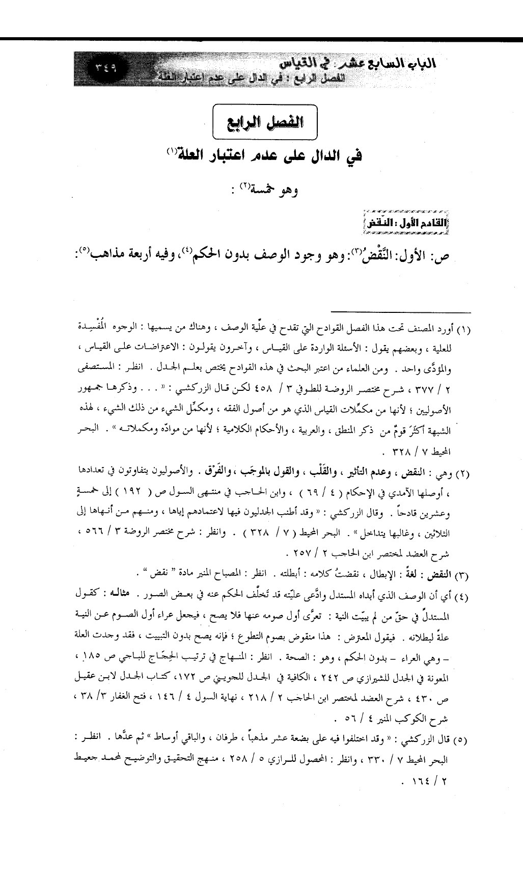 (¬4) أي أن الوصف الذي أبداه المستدل وادَّعى عليّته قد تَخلَّف الحكم عنه في بعض الصور. مثاله: كقول المستدلِّ في حقّ من لم يبيّت النية: تعرَّى أول صومه عنها فلا يصح، فيجعل عراء أول الصوم عن النية علةً لبطلانه. فيقول المعترض: هذا منقوض بصوم التطوع؛ فإنه يصح بدون التبييت، فقد وجدت العلة - وهي العراء - بدون الحكم، وهو: الصحة. انظر: المنهاج في ترتيب الحِجَاج للباجي ص 185، المعونة في الجدل للشيرازي ص 242، الكافية في الجدل للجويني ص 172، كتاب الجدل لابن عقيل
