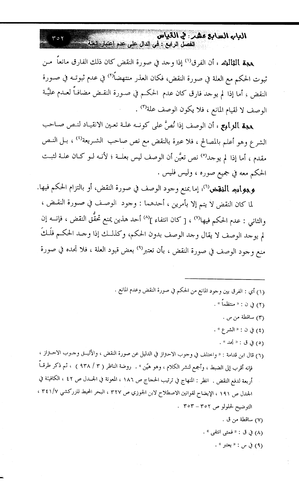 (¬6) قال ابن قدامة: ((واختلف في وجوب الاحتراز في الدليل عن صورة النقض، والأليق وجوب الاحتراز، فإنه أقرب إلى الضبط، وأجمع لنشر الكلام، وهو هيّن)) . روضة الناظر (3 / 938) ، ثم ذكر طرقاً أربعة لدفع النقض. انظر: المنهاج في ترتيب الحجاج ص 186، المعونة في الجدل ص 42، الكافية في الجدل ص 191، الايضاح لقوانين الاصطلاح لابن الجوزي ص 327، البحر المحيط للزركشي 7/341، التوضيح لحلولو ص 352 - 353.