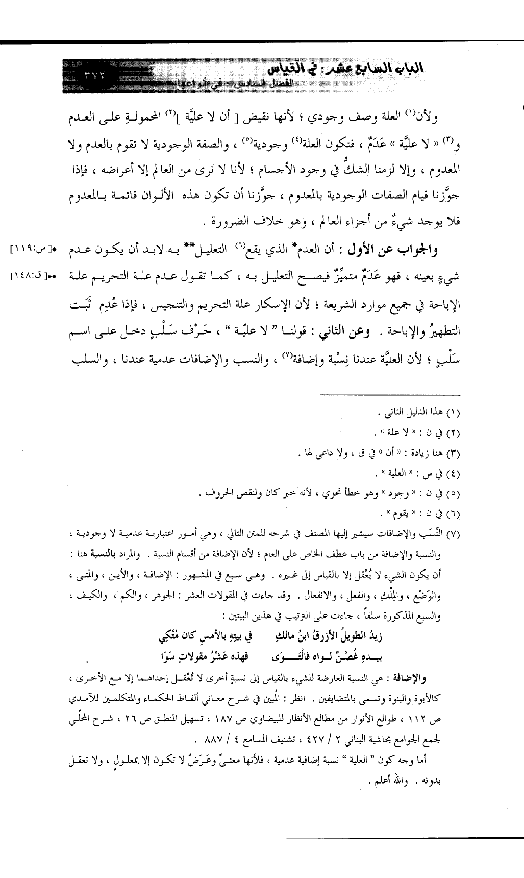والجواب عن الأول: أن العدم* الذي يقع (¬6) التعليل** به لابد أن يكون عدم شيءٍ بعينه، فهو عَدَمٌ متميِّزٌ فيصح التعليل به، كما تقول عدم علة التحريم علة الإباحة في جميع موارد الشريعة؛ لأن الإسكار علة التحريم والتنجيس، فإذا عُدِم ثَبَت التطهيرُ والإباحة. وعن الثاني: قولنا " لا عليّة "، حَرْف سَلْبٍ دخل على اسم سَلْبٍ؛ لأن العليَّة عندنا نِسْبة وإضافة (¬7) ، والنسب والإضافات عدمية عندنا، والسلب