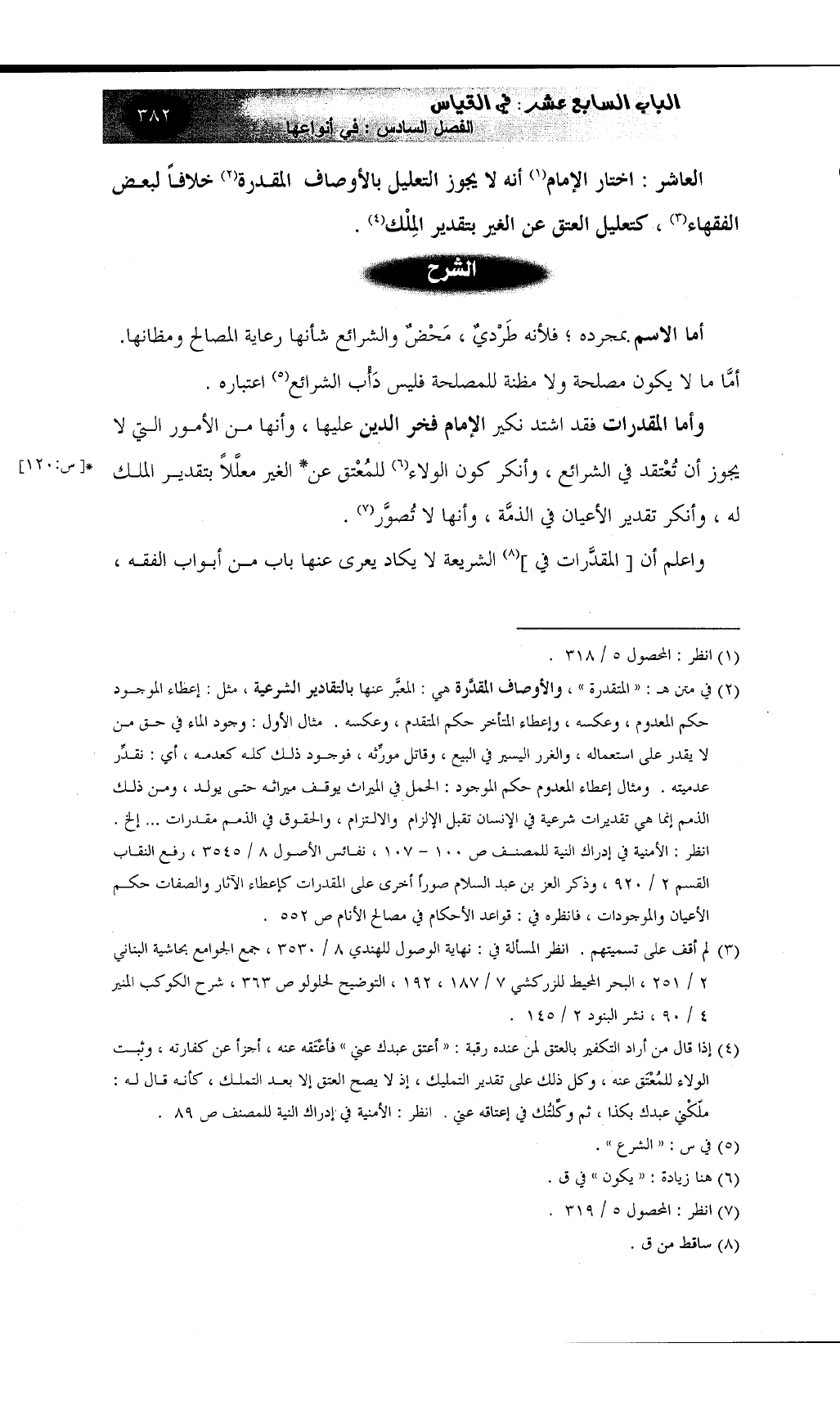 العاشر: اختار الإمام (¬1) أنه لا يجوز التعليل بالأوصاف المقدرة (¬2) خلافاً لبعض الفقهاء (¬3) ، كتعليل العتق عن الغير بتقدير المِلْك (¬4) .