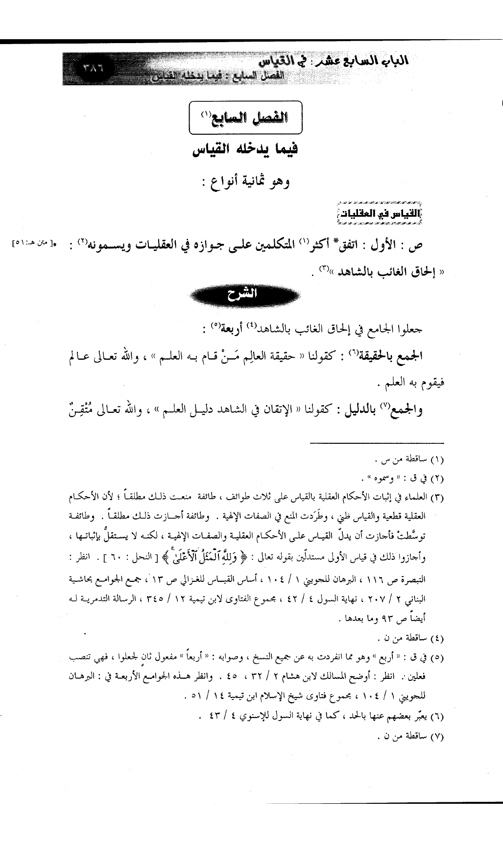 (¬3) العلماء في إثبات الأحكام العقلية بالقياس على ثلاث طوائف، طائفة منعت ذلك مطلقاً؛ لأن الأحكام العقلية قطعية والقياس ظني، وطَرَدت المنع في الصفات الإلهية. وطائفة أجازت ذلك مطلقاً. وطائفة توسَّطتْ فأجازت أن يدلّ القياس على الأحكام العقلية والصفات الإلهية، لكنه لا يستقلُّ بإثباتها، وأجازوا ذلك في قياس الأولى مستدلّين بقوله تعالى: {وَلِلّهِ الْمَثَلُ الأَعْلَىَ} [النحل: 60] . انظر: التبصرة ص 116، البرهان للجويني 1 / 104، أساس القياس للغزالي ص 13، جمع الجوامع بحاشية البناني 2 / 207، نهاية السول 4 / 42، مجموع الفتاوى لابن تيمية 12 / 345، الرسالة التدمرية له أيضاً ص 93 وما بعدها.