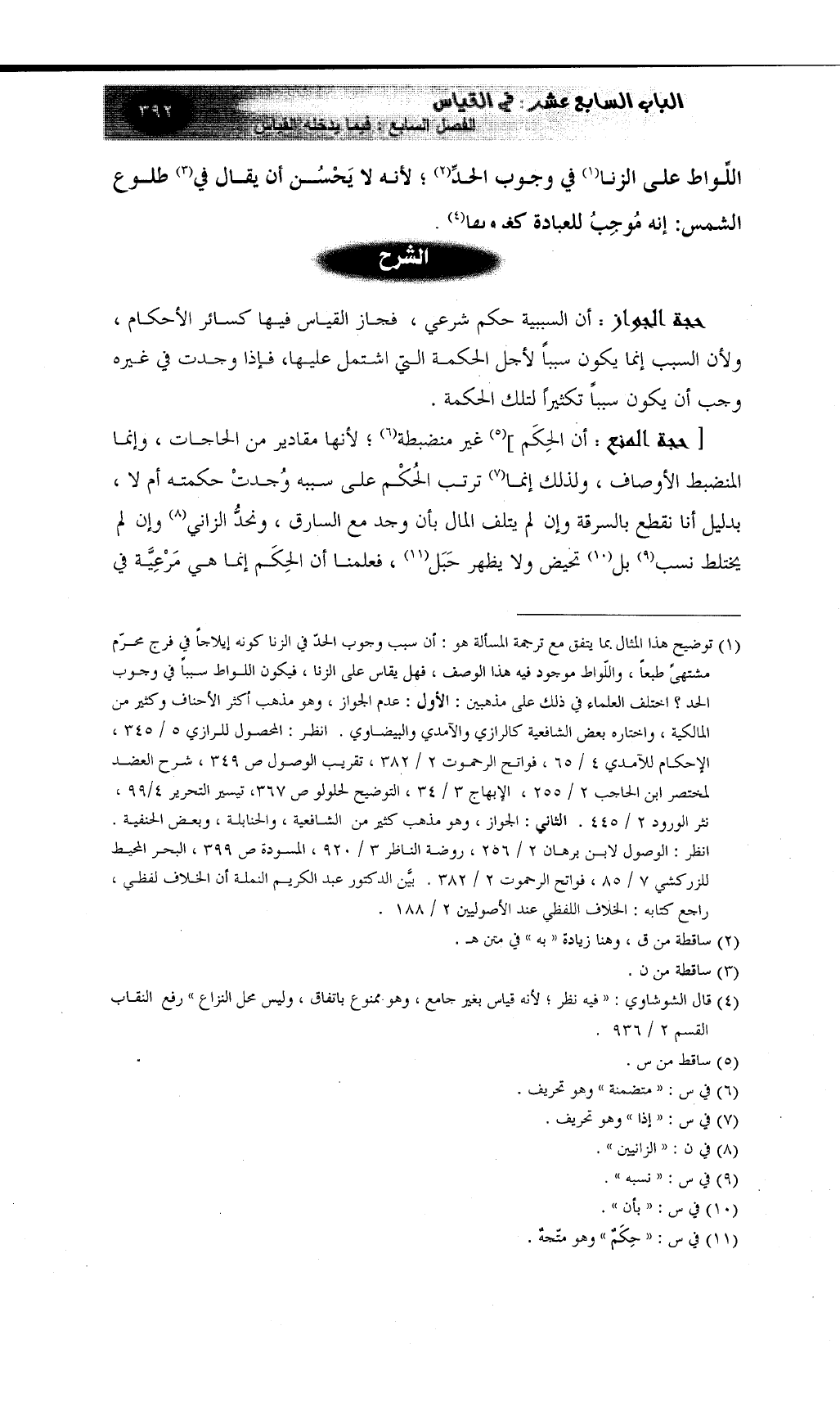 (¬1) توضيح هذا المثال بما يتفق مع ترجمة المسألة هو: أن سبب وجوب الحدّ في الزنا كونه إيلاجاً في فرج محرّم مشتهىً طبعاً، واللّواط موجود فيه هذا الوصف، فهل يقاس على الزنا، فيكون اللواط سبباً في وجوب الحد؟ اختلف العلماء في ذلك على مذهبين: الأول: عدم الجواز، وهو مذهب أكثر الأحناف وكثير من المالكية، واختاره بعض الشافعية كالرازي والآمدي والبيضاوي. انظر: المحصول للرازي 5 / 345، الإحكام للآمدي 4 / 65، فواتح الرحموت 2 / 382، تقريب الوصول ص 349، شرح العضد لمختصر ابن الحاجب 2 / 255، الإبهاج 3 / 34، التوضيح لحلولو ص 367، تيسير التحرير 4/99، نثر الورود 2 / 445. الثاني: الجواز، وهو مذهب كثير من الشافعية، والحنابلة، وبعض الحنفية. انظر: الوصول لابن برهان 2 / 256، روضة الناظر 3 / 920، المسودة ص 399، البحر المحيط للزركشي 7 / 85، فواتح الرحموت 2 / 382. بيَّن الدكتور عبد الكريم النملة أن الخلاف لفظي، راجع كتابه: الخلاف اللفظي عند الأصوليين 2 / 188.