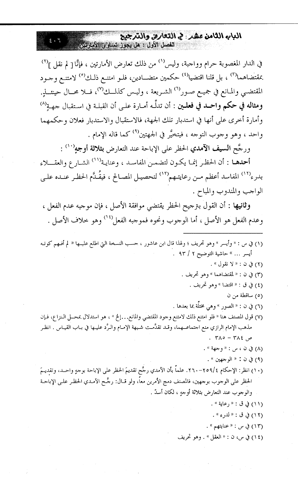 (¬10) انظر: الإحكام 4/259-260. علماً بأن الآمدي رجَّح تقديم الحظر على الإباحة بوجهٍ واحد، وتقديم الحظر على الوجوب بوجهين، فالمصنف دمج الأمرين معاً، ولو قال: رجَّح الآمدي الحظر على الإباحة والوجوب عند التعارض بثلاثة أوجهٍ، لكان أسدّ.