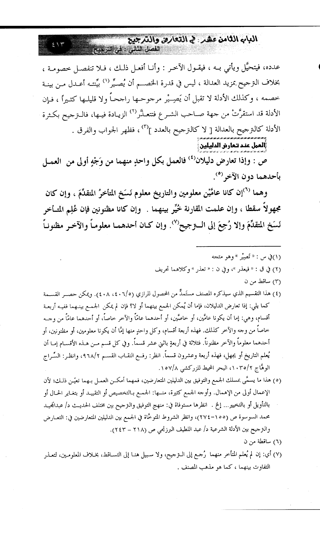 (¬4) هذا التقسيم الذي سيذكره المصنف مستَمدٌّ من المحصول للرازي (5/406، 408) . ويمكن حصر القسمة كما يلي: إذا تعارض الدليلان، فإما أن يُمكن الجمع بينهما أو لا؟ فإن لم يمكن الجمع بينهما ففيه أربعة أقسام، وهي: إما أن يكونا عامَّين، أو خاصَّين، أو أحدهما عامّاً والآخر خاصاً، أو أحدهما عامّاً من وجه خاصاً من وجه والآخر كذلك. فهذه أربعة أقسام، وكل واحدٍ منها إمَّا أن يكونا معلومين، أو مظنونين، أو أحدهما معلوماً والآخر مظنوناً. فثلاثة في أربعةٍ باثني عشر قسماً. وفي كل قسم من هذه الأقسام إما أن يُعلم التاريخ أو يجهل، فهذه أربعة وعشرون قسماً. انظر: رفع النقاب القسم 2/968، وانظر: السِّراج الوهَّاج 2/1035، البحر المحيط للزركشي 8/157.