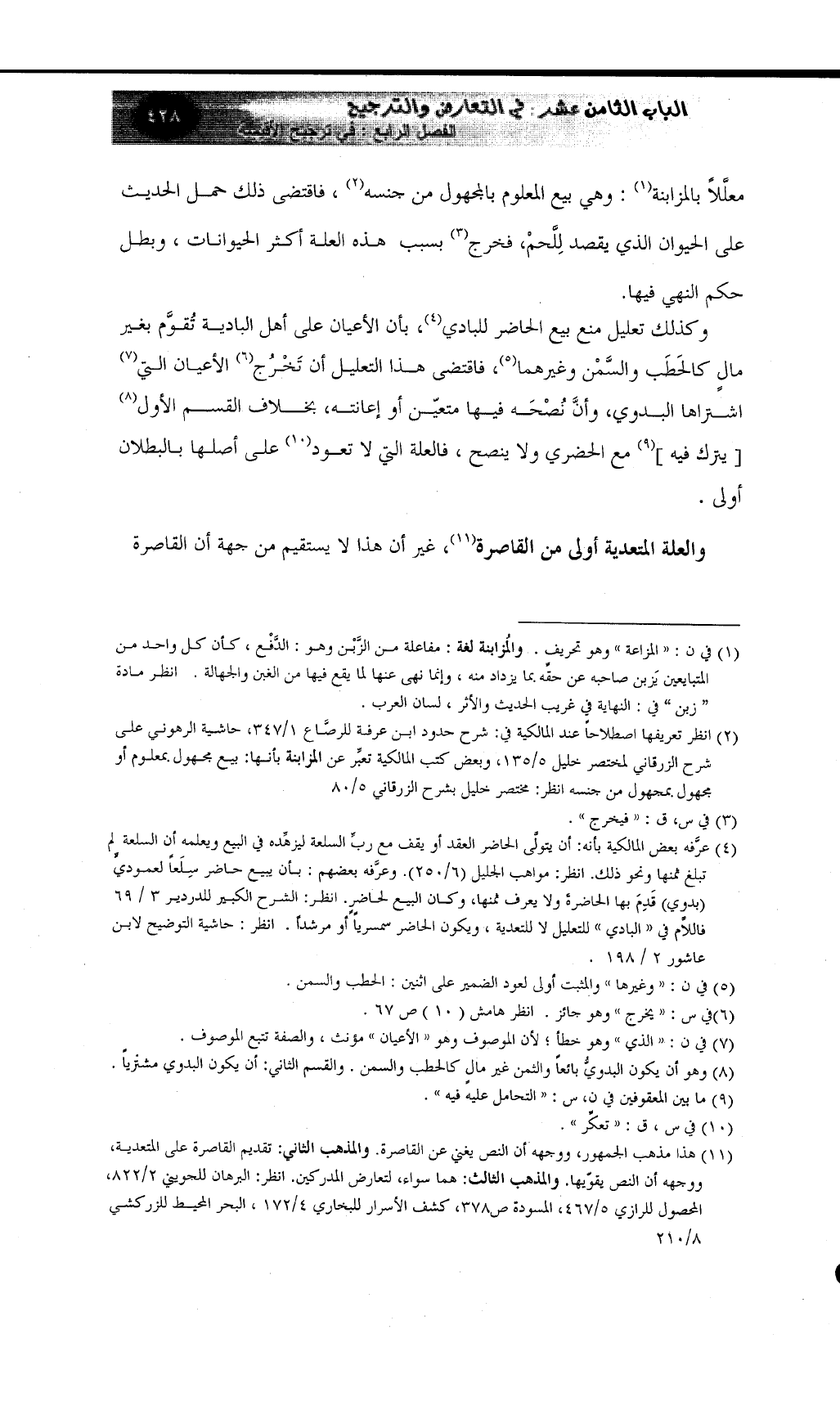 وكذلك تعليل منع بيع الحاضر للبادي (¬4) ، بأن الأعيان على أهل البادية تُقوَّم بغير مالٍ كالحَطَب والسَّمْن وغيرهما (¬5) ، فاقتضى هذا التعليل أن تَخْرُج (¬6) الأعيان التي (¬7) اشتراها البدوي، وأنَّ نُصْحَه فيها متعيَّن أو إعانته، بخلاف القسم الأول (¬8) [يترك فيه] (¬9) مع الحضري ولا ينصح، فالعلة التي لا تعود (¬10) على أصلها بالبطلان