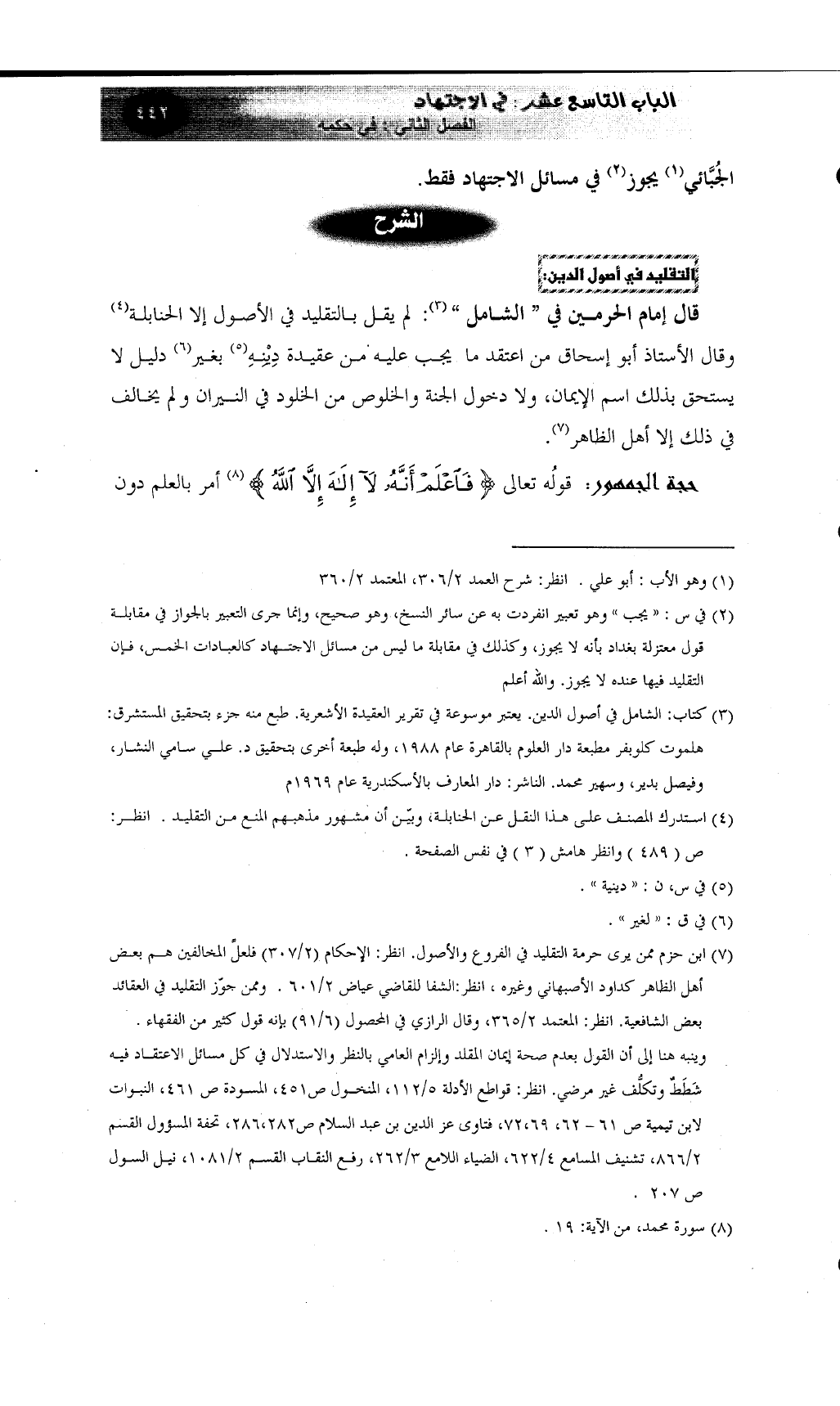 (¬7) ابن حزم ممن يرى حرمة التقليد في الفروع والأصول. انظر الإحكام 2/307 فلعلَّ المخالفين هم بعض أهل الظاهر كداود الأصبهاني وغيره انظر: الشفا للقاضي عياض 2/601. وممن جوّز التقليد في العقائد بعض الشافعية. انظر: المعتمد 2/365، وقال الرازي في المحصول (6/91) بإنه قول كثير من الفقهاء.