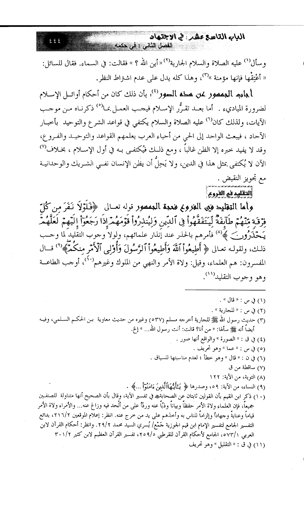 وأما التقليد في الفروع فحجة الجمهور قوله تعالى {فَلَوْلاَ نَفَرَ مِن كُلِّ فِرْقَةٍ مِّنْهُمْ طَآئِفَةٌ لِّيَتَفَقَّهُواْ فِي الدِّينِ وَلِيُنذِرُواْ قَوْمَهُمْ إِذَا رَجَعُواْ إِلَيْهِمْ لَعَلَّهُمْ يَحْذَرُونَ} (¬8) فأمرهم بالحذر عند إنذار علمائهم، ولولا وجوب التقليد لما وجب ذلك، ولقوله تعالى: {أَطِيعُواْ اللَّهَ وَأَطِيعُواْ الرَّسُولَ وَأُوْلِي الأَمْرِ مِنكُمْ} (¬9) قال المفسرون: هم العلماء، وقيل: ولاة الأمر والنهي من الملوك وغيرهم (¬10) ، أوجب الطاعة وهو وجوب التقليد (¬11) .