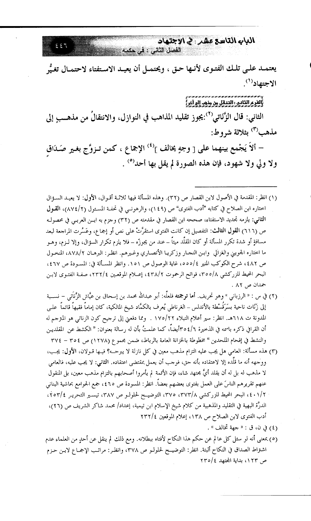 الثاني: قال الزَّنَاتيَ (¬2) : يجوز تقليد المذاهب في النوازل، والانتقالُ من مذهبٍ إلى مذهب (¬3) بثلاثة شروط: