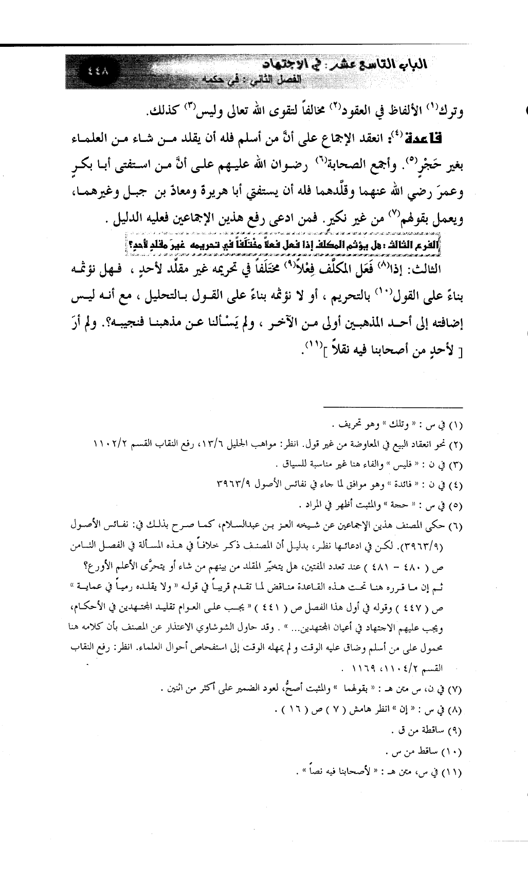 ص (447) وقوله في أول هذا الفصل ص (441) ((يجب على العوام تقليد المجتهدين في الأحكام، ويجب عليهم الاجتهاد في أعيان المجتهدين ... )) . وقد حاول الشوشاوي الاعتذار عن المصنف بأن كلامه هنا محمول على من أسلم وضاق عليه الوقت ولم يمهله الوقت إلى استفحاص أحوال العلماء. انظر: رفع النقاب القسم 2/1104، 1169.