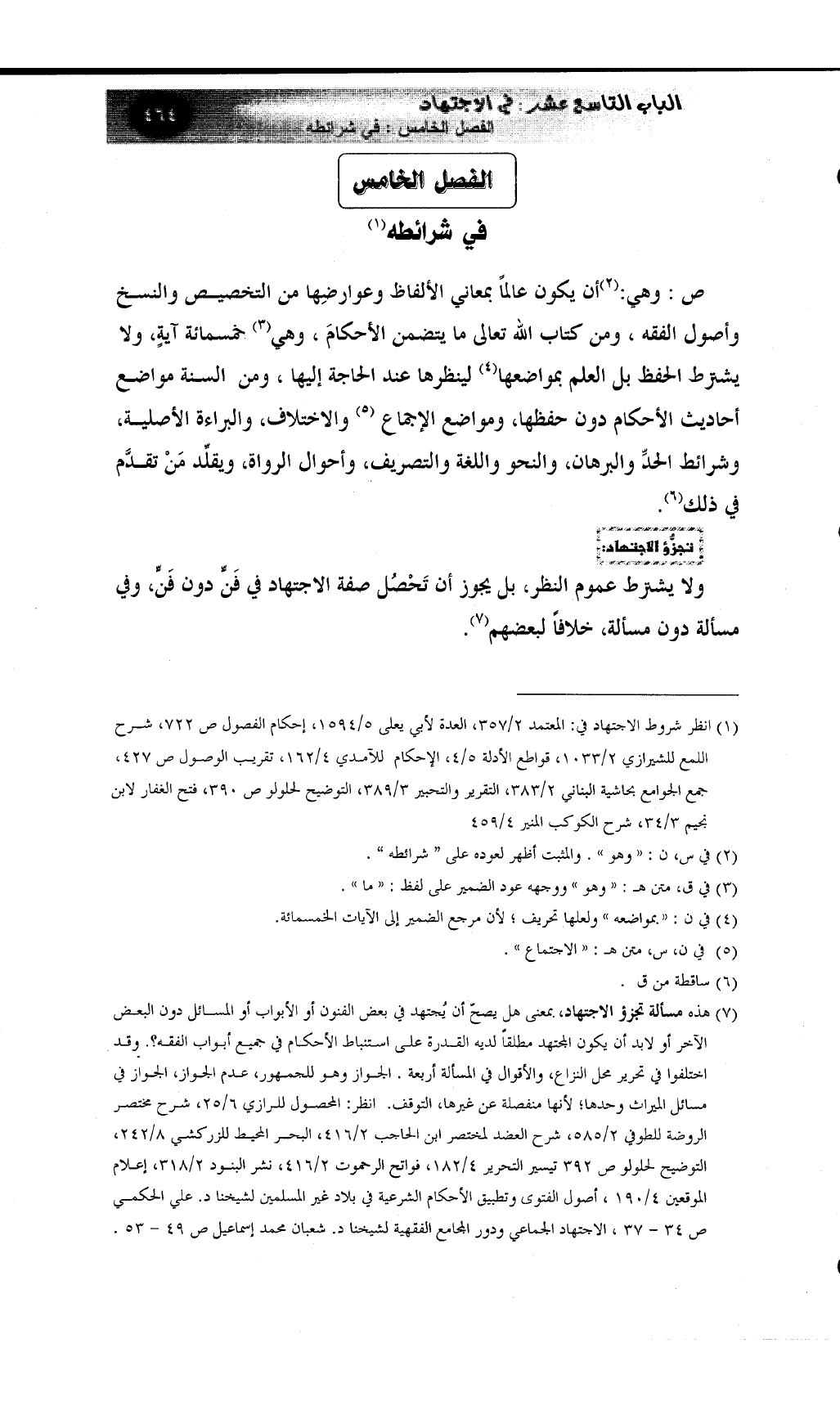 (¬7) هذه مسألة تجزؤ الاجتهاد، بمعنى هل يصحّ أن يُجتهد في بعض الفنون أو الأبواب أو المسائل دون البعض الآخر أو لابد أن يكون المجتهد مطلقاً لديه القدرة على استنباط الأحكام في جميع أبواب الفقه؟. وقد اختلفوا في تحرير محل النزاع، والأقوال في المسألة أربعة. الجواز وهو للجمهور، عدم الجواز، الجواز في مسائل الميراث وحدها؛ لأنها منفصلة عن غيرها، التوقف. انظر: المحصول للرازي 6/25، شرح مختصر الروضة للطوفي 2/585، شرح العضد لمختصر ابن الحاجب 2/416، البحر المحيط للزركشي 8/242، التوضيح لحلولو ص 392 تيسير التحرير 4/182، فواتح الرحموت 2/416، نشر البنود 2/318، إعلام الموقعين 4/190، أصول الفتوى وتطبيق الأحكام الشرعية في بلاد غير المسلمين لشيخنا د. علي الحكمي ص 34 - 37، الاجتهاد الجماعي ودور المجامع الفقهية لشيخنا د. شعبان محمد إسماعيل ص 49 - 53.