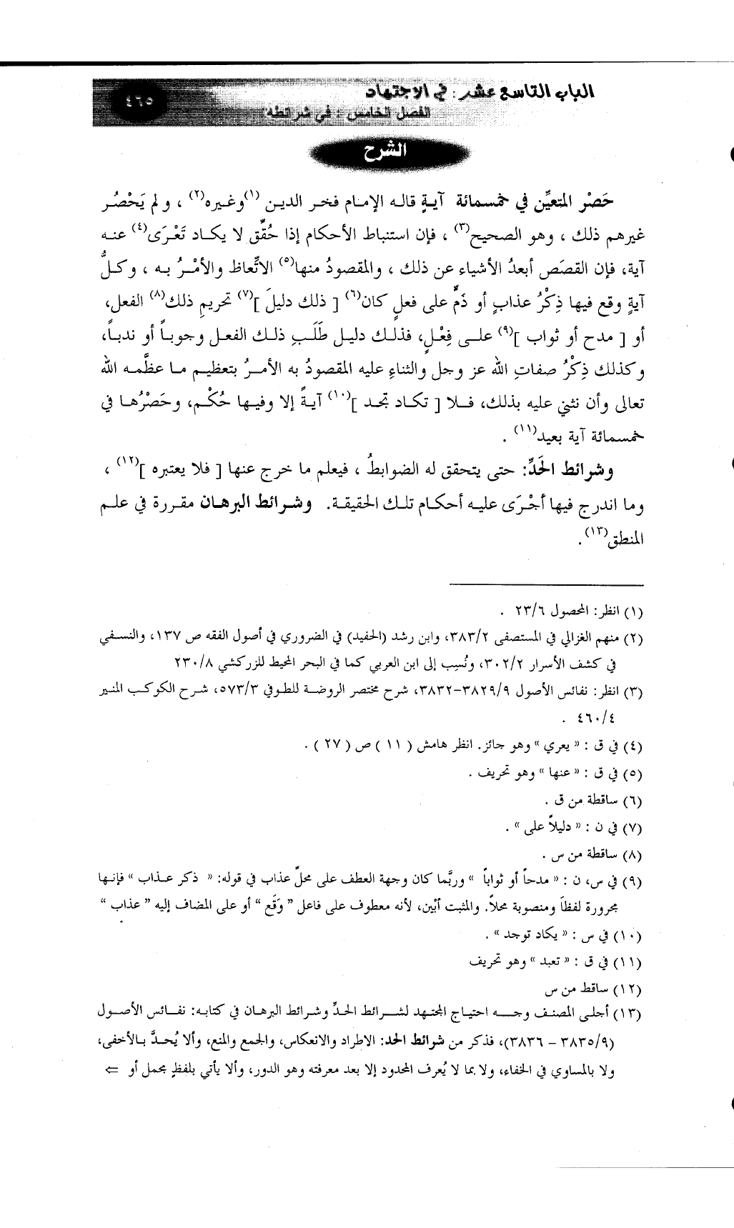 (¬13) أجلى المصنف وجه احتياج المجتهد لشرائط الحدِّ وشرائط البرهان في كتابه: نفائس الأصول (9/3835 - 3836) ، فذكر من شرائط الحد: الاطراد والانعكاس، والجمع والمنع، وألا يُحدَّ بالأخفى، ولا بالمساوي في الخفاء، ولا بما لا يُعرف المحدود إلا بعد معرفته وهو الدور، وألا يأتي بلفظٍ مجمل أو بمجاز بعيد، وأن يقدِّم الأعم على الأخص. وأما شرائط البرهان فكتقديم المقدمة الصغرى على الكبرى ثم النتيجة، وأن يعلم المُنْتِج والعقيم.. إلخ وانظر في هذا: معيار المعلم في فن المنطق للغزالي ص 98 - 114، 192 - 205، آداب البحث والمناظرة للشنقيطي 1/42، 72 وما بعدهما.