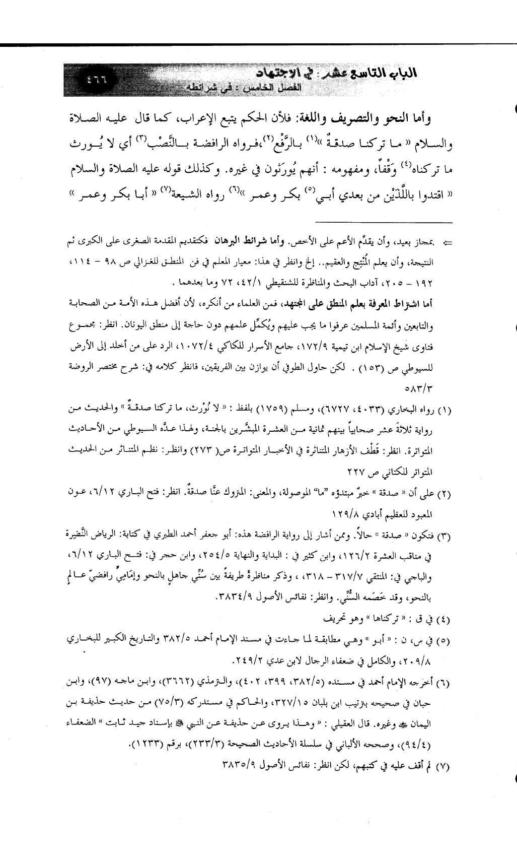 وأما النحو والتصريف واللغة: فلأن الحكم يتبع الإعراب، كما قال عليه الصلاة والسلام ((ما تركنا صدقةٌ)) (¬1)