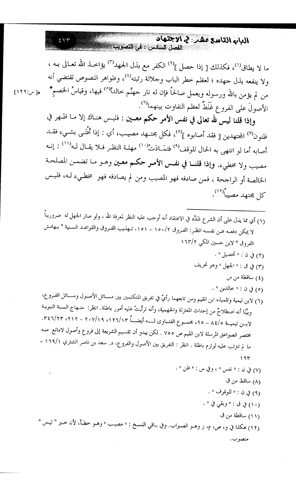 (¬6) لابن تيمية وتلميذه ابن القيم ومن تابعهما رأيٌ في تفريق المتكلمين بين مسائل الأصول ومسائل الفروع، وبيّنا أنه اصطلاحٌ من إحداث المعتزلة والجهمية، وأنه ترتَّبتْ عليه أمور باطلة. انظر: منهاج السنة النبوية لابن تيمية 5/84 - 95، مجموع الفتاوى له أيضاً 13/126، 19/207 - 212، 23/346.
