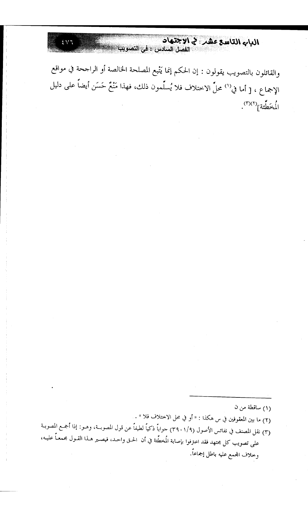 (¬3) نقل المصنف في نفائس الأصول (9/3901) جواباً ذكياً لطيفاً عن قول المصوبة، وهو: إذا أجمع المصوبة على تصويب كل مجتهد فقد اعترفوا بإصابة المُخطِّئة في أن الحق واحد، فيصير هذا القول مجمعاً عليه، وخلاف المجمع عليه باطل إجماعاً.