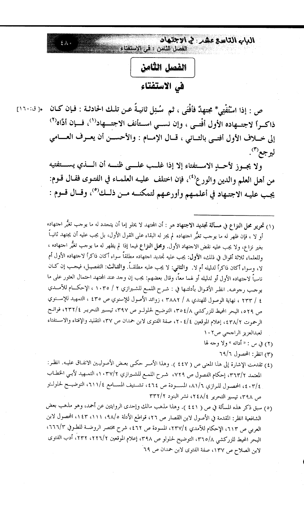 (¬5) سبق ذكر هذه المسألة، وهذا مذهب مالك وإحدى الروايتين عن أحمد، وهو مذهب بعض الشافعية انظر: المقدمة في الأصول لابن القصار ص 26، قواطع الأدلة 5/98، 111، 143، المحصول لابن العربي ص 613، الإحكام للآمدي 4/237، المسودة ص 462، شرح مختصر الروضة للطوفي 3/666، البحر المحيط للزركشي 8/365، التوضيح لحلولو ص 398، إعلام الموقعين 2/226، 232، أدب الفتوى لابن الصلاح ص 137، صفة الفتوى لابن حمدان ص 69