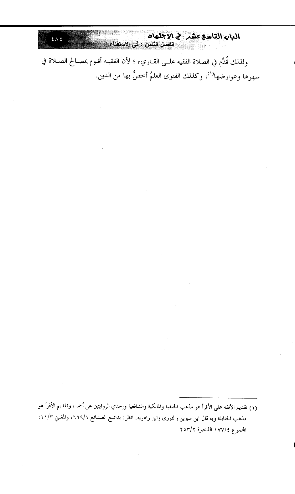 (¬1) تقديم الأفقه على الأقرأ هو مذهب الحنفية والمالكية والشافعية وإحدي الروايتين عن أحمد، وتقديم الأقرأ هو مذهب الحنابلة وبه قال ابن سيرين والثوري وابن راهويه. انظر: بدائع الصنائع 1/669، والمغني 3/11، المجموع 4/177 الذخيرة 2/253