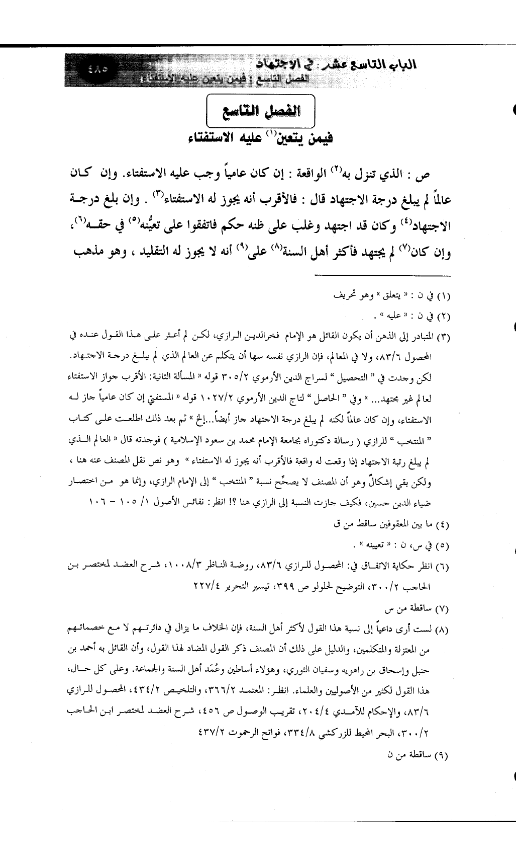 (¬3) المتبادر إلى الذهن أن يكون القائل هو الإمام فخرالدين الرازي، لكن لم أعثر على هذا القول عنده في المحصول 6/83، ولا في المعالم، فإن الرازي نفسه سها أن يتكلم عن العالم الذي لم يبلغ درجة الاجتهاد. لكن وجدت في " التحصيل " لسراج الدين الأرموي 2/305 قوله ((المسألة الثانية: الأقرب جواز الاستفتاء لعالم غير مجتهد ... )) وفي " الحاصل " لتاج الدين الأرموي 2/1027 قوله ((المستفتي إن كان عامياً جاز له الاستفتاء، وإن كان عالماً لكنه لم يبلغ درجة الاجتهاد جاز أيضاً ... إلخ)) ثم بعد ذلك اطلعت على كتاب " المنتخب " للرازي (رسالة دكتوراه بجامعة الإمام محمد بن سعود الإسلامية) فوجدته قال ((العالم الذي لم يبلغ رتبة الاجتهاد إذا وقعت له واقعة فالأقرب أنه يجوز له الاستفتاء)) وهو نص نقل المصنف عنه هنا، ولكن بقي إشكالٌ وهو أن المصنف لا يصحِّح نسبة " المنتخب " إلى الإمام الرازي، وإنما هو من اختصار ضياء الدين حسين، فكيف حازت النسبة إلى الرازي هنا؟! انظر: نفائس الأصول 1/ 105 - 106