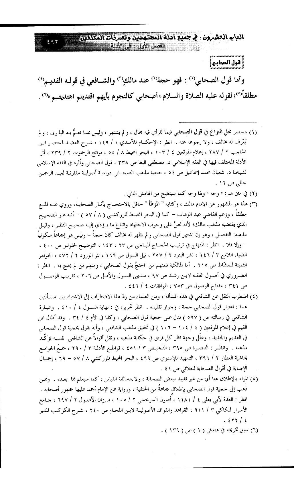 (¬1) ينحصر محل النزاع في قول الصحابي فيما للرأي فيه مجال، ولم يشتهر، وليس مما تعمُّ به البلوى، ولم يُعْرف له مخالف، ولا رجوعه عنه. انظر: الإحكام للآمدي 4 / 149، شرح العضد لمختصر ابن الحاجب 2 / 287، إعلام الموقعين 4 / 103، البحر المحيط 8 / 55، فواتح الرحموت 2 / 239، أثر الأدلة المختلف فيها في الفقه الإسلامي د. مصطفى البغا ص 338، قول الصحابي وأثره في الفقه الإسلامي لشيخنا د. شعبان محمد إسماعيل ص 54، حجية مذهب الصحابي دراسة أصولية مقارنة لعبد الرحمن حللي ص 12.