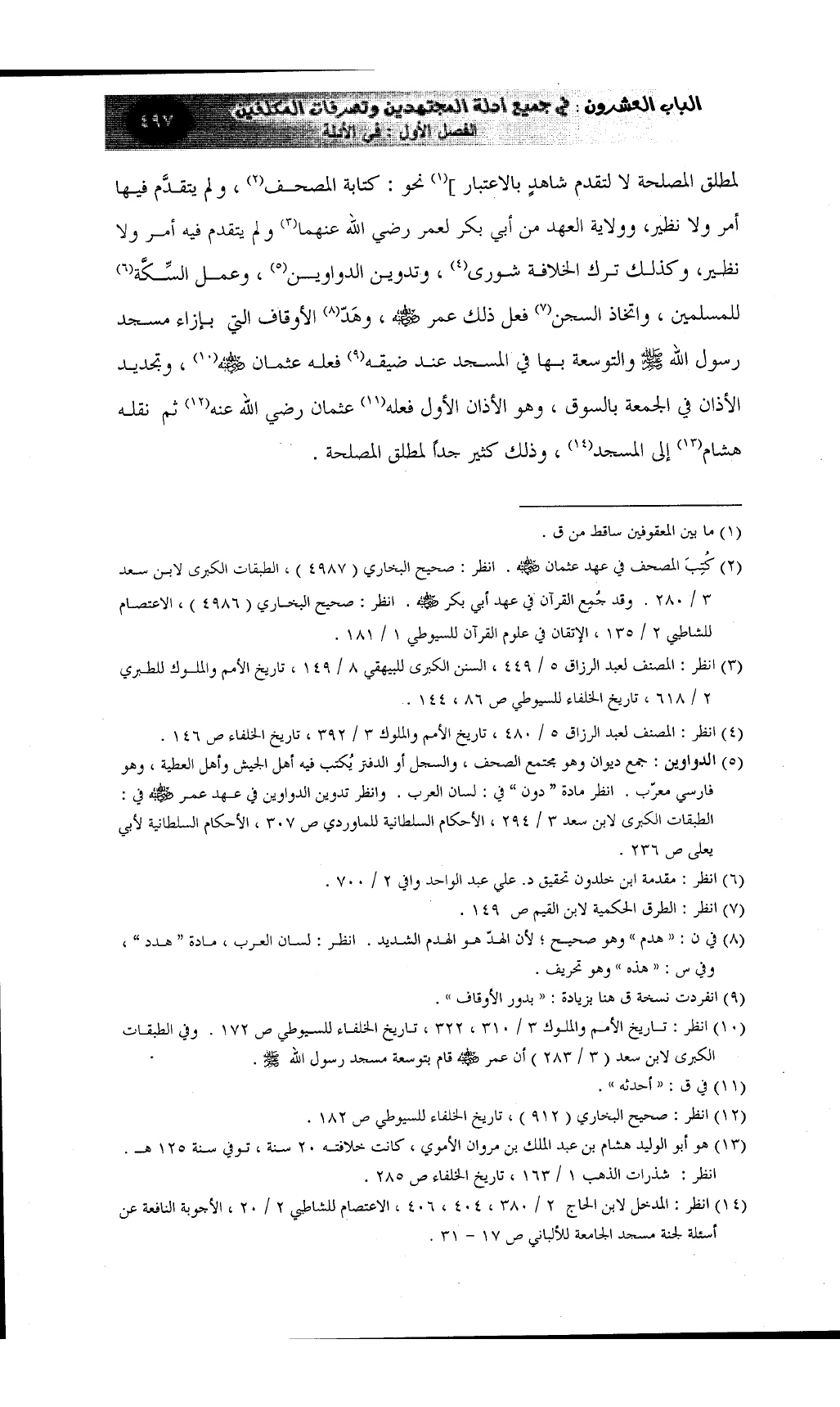 الأوقاف التي بإزاء مسجد رسول الله صلى الله عليه وسلم والتوسعة بها في المسجد عند ضيقه (¬9) فعله عثمان رضي الله عنه (¬10) ، وتجديد الأذان في الجمعة بالسوق، وهو الأذان الأول فعله (¬11) عثمان رضي الله عنه (¬12) ثم نقله هشام (¬13) إلى المسجد (¬14) ، وذلك كثير جداً لمطلق المصلحة.