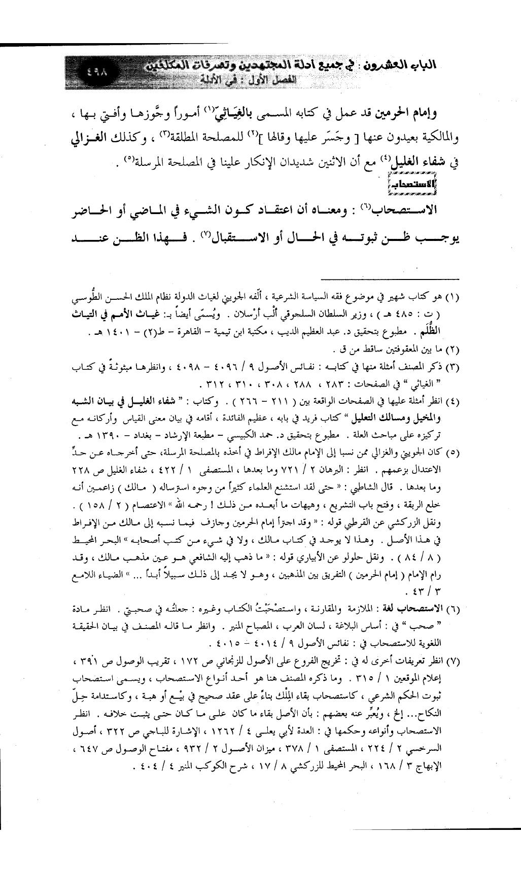 (¬4) انظر أمثلة عليها في الصفحات الواقعة بين (211 - 266) . وكتاب: " شفاء الغليل في بيان الشبه والمخيل ومسالك التعليل " كتاب فريد في بابه، عظيم الفائدة، أقامه في بيان معنى القياس وأركانه مع تركيزه على مباحث العلة. مطبوع بتحقيق د. حمد الكبيسي - مطبعة الإرشاد - بغداد - 1390 هـ.