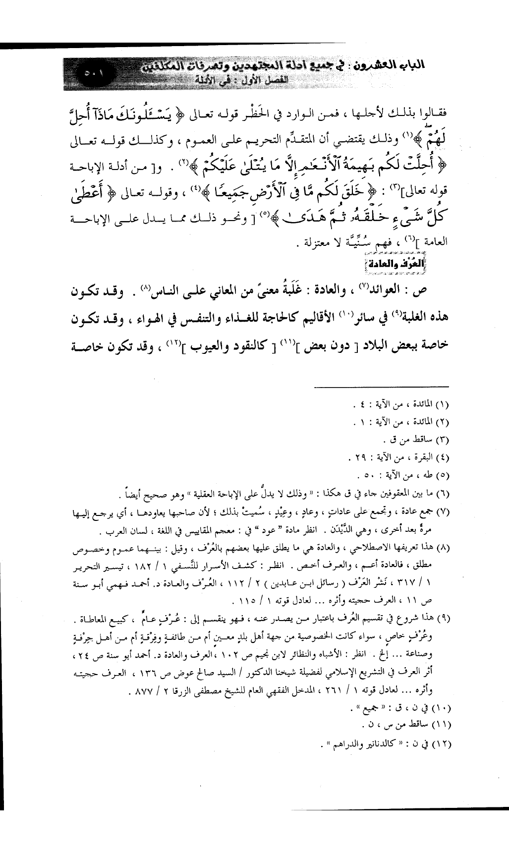 (¬8) هذا تعريفها الاصطلاحي، والعادة هي ما يطلق عليها بعضهم بالعُرْف، وقيل: بينهما عموم وخصوص مطلق، فالعادة أعم، والعرف أخص. انظر: كشف الأسرار للنَّسفي 1 / 182، تيسير التحرير
