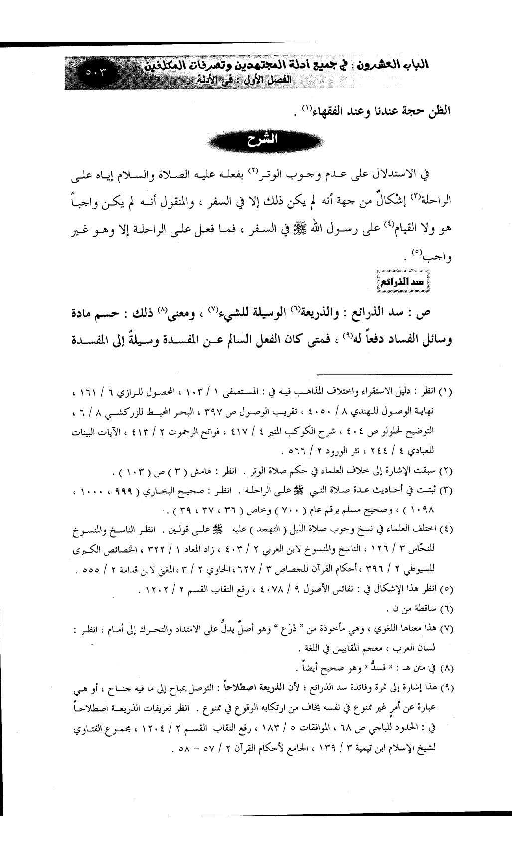 (¬9) هذا إشارة إلى ثمرة وفائدة سد الذرائع؛ لأن الذريعة اصطلاحاً: التوصل بمباح إلى ما فيه جناح، أو هي عبارة عن أمرٍ غير ممنوع في نفسه يخاف من ارتكابه الوقوع في ممنوع. انظر تعريفات الذريعة اصطلاحاً