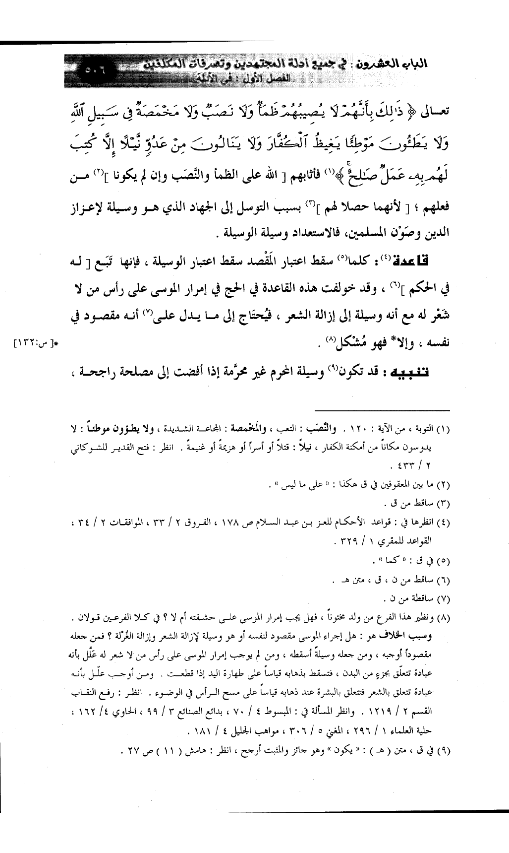 قاعدة (¬4) : كلما (¬5) سقط اعتبار المَقْصد سقط اعتبار الوسيلة، فإنها تَبَع [له في الحكم] (¬6) ، وقد خولفت هذه القاعدة في الحج في إمرار الموسى على رأس من لا شَعْر له مع أنه وسيلة إلى إزالة الشعر، فيُحتَاج إلى ما يدل على (¬7) أنه مقصود في نفسه، وإلا* فهو مُشْكل (¬8) .