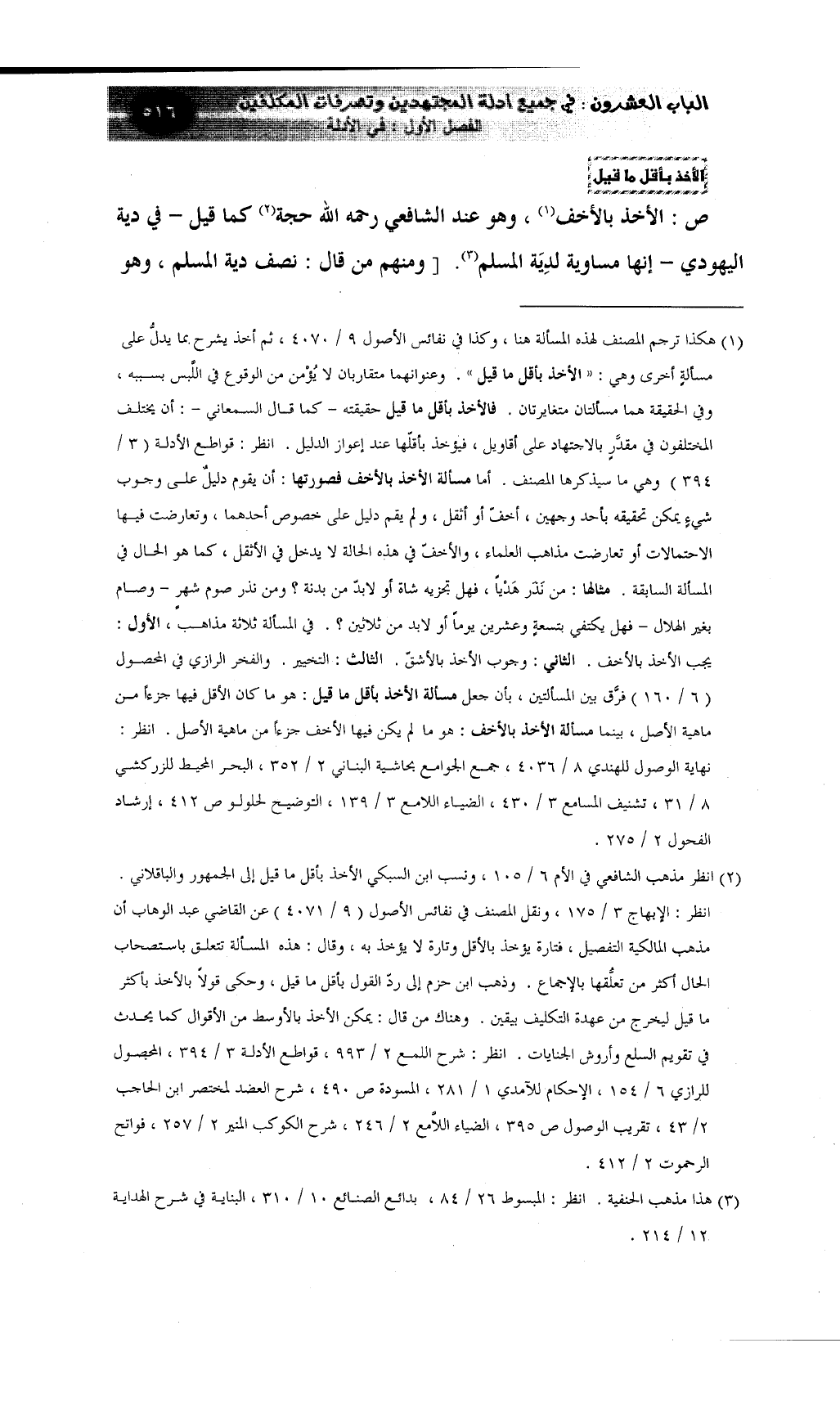 (¬1) هكذا ترجم المصنف لهذه المسألة هنا، وكذا في نفائس الأصول 9 / 4070، ثم أخذ يشرح بما يدلُّ على مسألةٍ أخرى وهي: ((الأخذ بأقل ما قيل)) . وعنوانهما متقاربان لا يُؤْمن من الوقوع في اللَّبس بسببه، وفي الحقيقة هما مسألتان متغايرتان. فالأخذ بأقل ما قيل حقيقته - كما قال السمعاني -: أن يختلف المختلفون في مقدَّرٍ بالاجتهاد على أقاويل، فيؤخذ بأقلّها عند إعواز الدليل. انظر: قواطع الأدلة (3 / 394) وهي ما سيذكرها المصنف. أما مسألة الأخذ بالأخف فصورتها: أن يقوم دليلٌ على وجوب شيءٍ يمكن تحقيقه بأحد وجهين، أخفّ أو أثقل، ولم يقم دليل على خصوص أحدهما، وتعارضت فيها الاحتمالات أو تعارضت مذاهب العلماء، والأخفّ في هذه الحالة لا يدخل في الأثقل، كما هو الحال في المسألة السابقة. مثالها: من نَذَر هَدْياً، فهل تجزيه شاة أو لابدّ من بدنة؟ ومن نذر صوم شهرٍ - وصام بغير الهلال - فهل يكتفي بتسعةٍ وعشرين يوماً أو لابد من ثلاثين؟ . في المسألة ثلاثة مذاهب، الأول: يجب الأخذ بالأخف. الثاني: وجوب الأخذ بالأشقّ. الثالث: التخيير. والفخر الرازي في المحصول