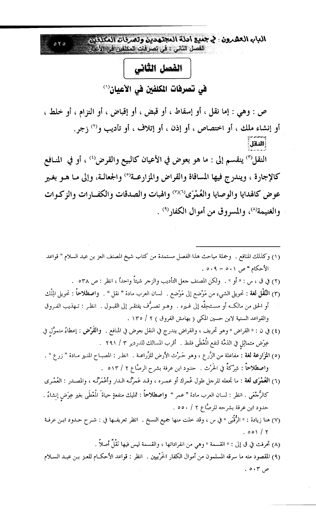 النقل (¬3) ينقسم إلى: ما هو بعوض في الأعيان كالبيع والقرض (¬4) ، أو في المنافع كالإجارة، ويندرج فيها المساقاة والقراض والمزارعة (¬5) والجعالة، وإلى ما هو بغير عوض كالهدايا والوصايا والعُمْرَى (¬6) (¬7)