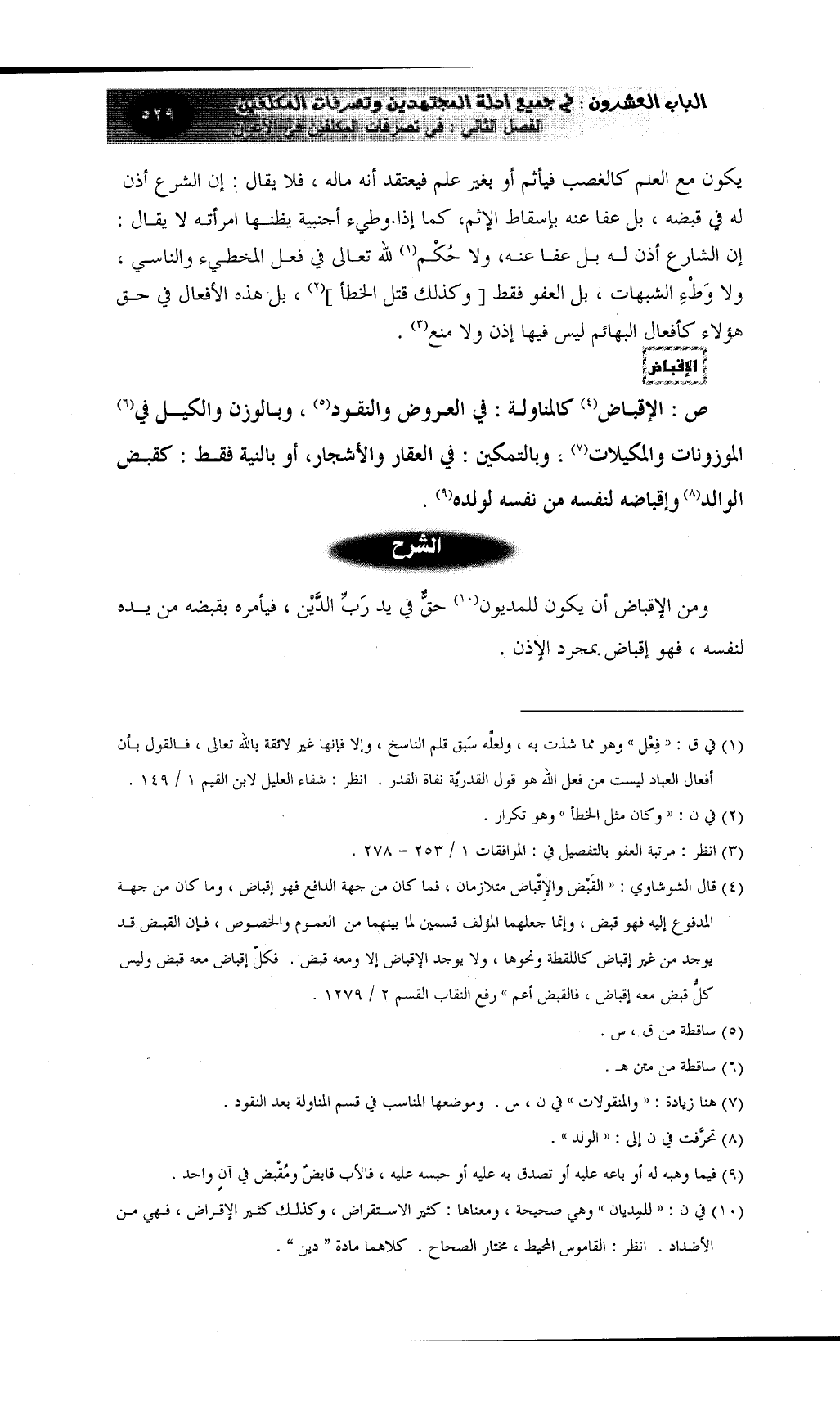 (¬4) قال الشوشاوي: ((القَبْض والإِقْباض متلازمان، فما كان من جهة الدافع فهو إقباض، وما كان من جهة المدفوع إليه فهو قبض، وإنما جعلهما المؤلف قسمين لما بينهما من العموم والخصوص، فإن القبض قد يوجد من غير إقباض كاللقطة ونحوها، ولا يوجد الإقباض إلا ومعه قبض. فكلّ إقباض معه قبض وليس كلُّ قبض معه إقباض، فالقبض أعم)) رفع النقاب القسم 2 / 1279.