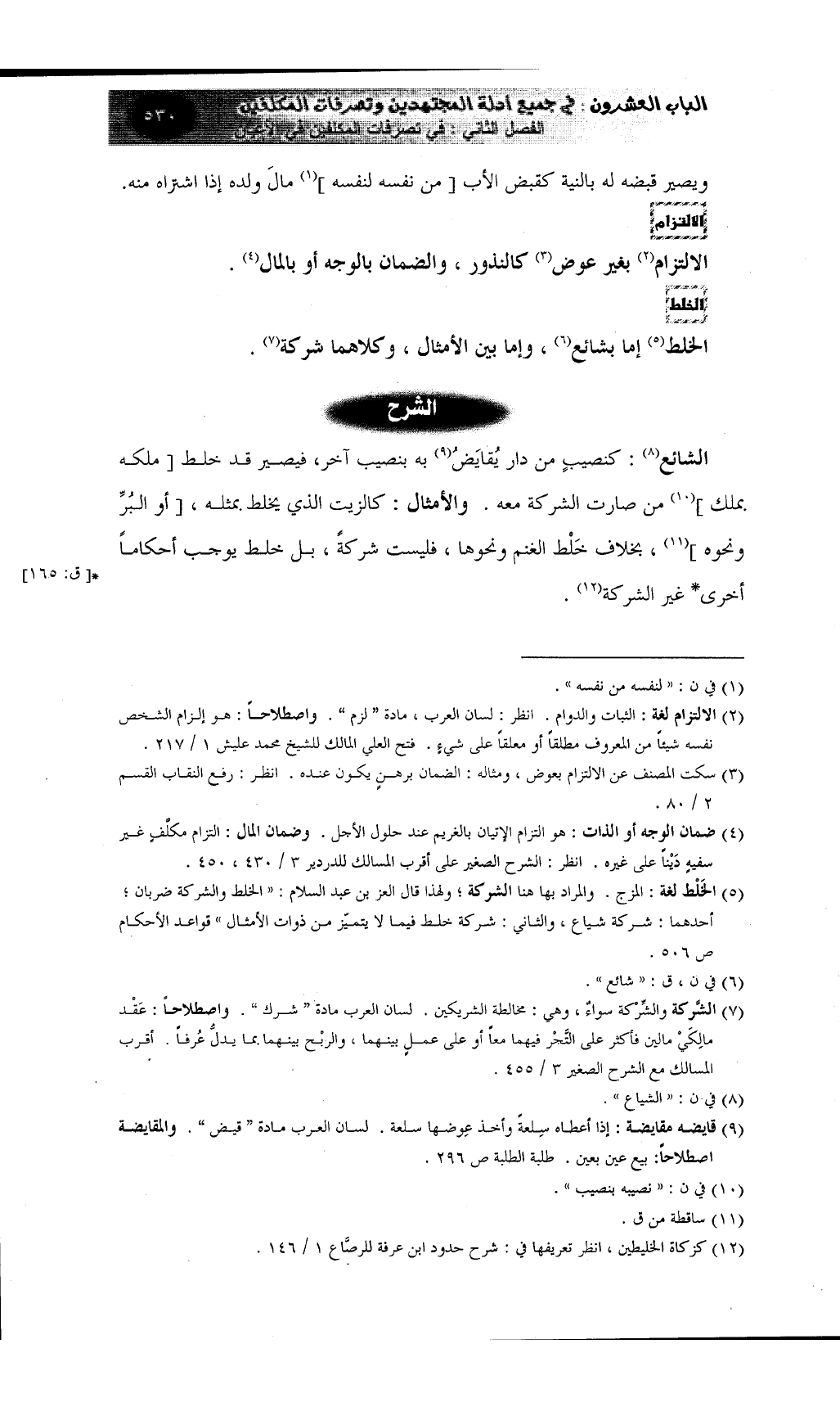 (¬5) الخَلْط لغة: المزج. والمراد بها هنا الشركة؛ ولهذا قال العز بن عبد السلام: ((الخلط والشركة ضربان؛ أحدهما: شركة شياع، والثاني: شركة خلط فيما لا يتميّز من ذوات الأمثال)) قواعد الأحكام