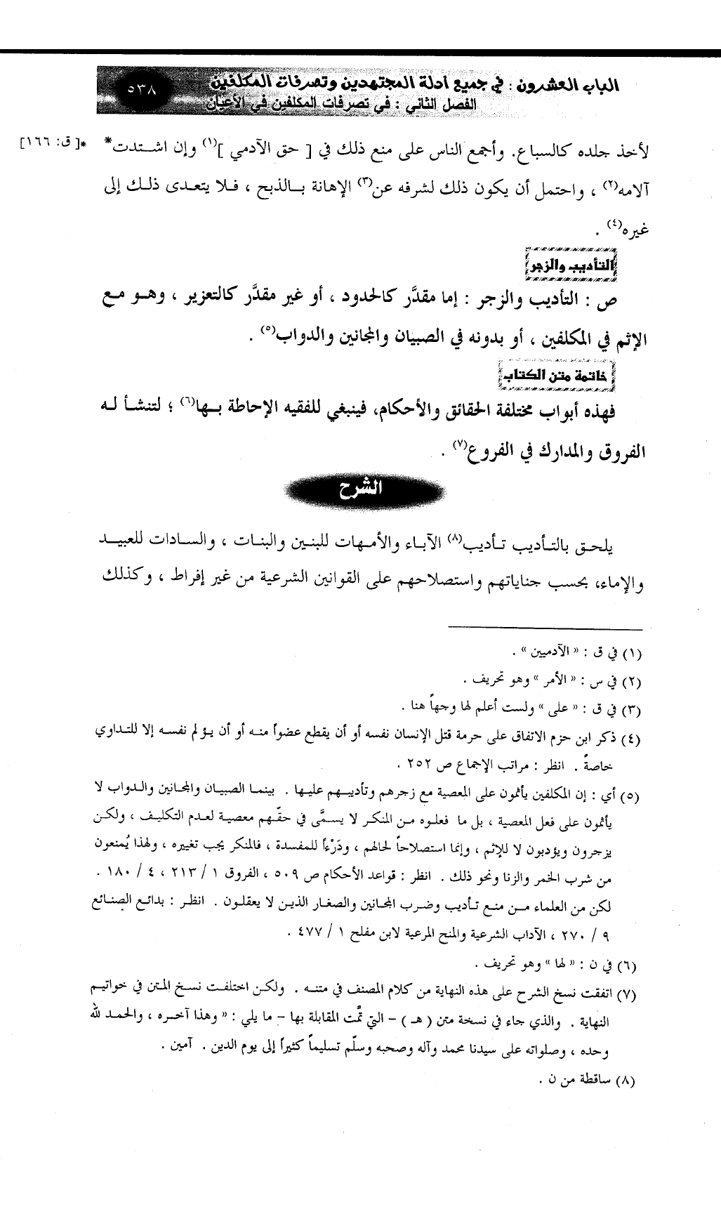 ص: التأديب والزجر: إما مقدَّر كالحدود، أو غير مقدَّر كالتعزير، وهو مع الإثم في المكلفين، أو بدونه في الصبيان والمجانين والدواب (¬5) .