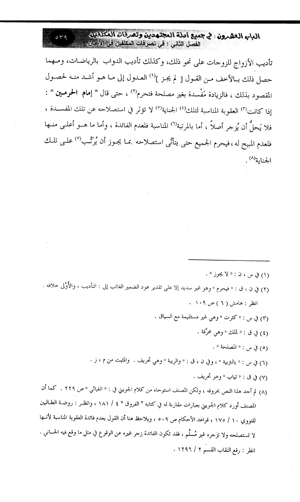 (¬8) لم أجد هذا النص بحروفه، ولكن المصنف استوحاه من كلام الجويني في: ((الغياثي)) ص 229. كما أن المصنف أورد كلام الجويني بعبارات مقاربة له في كتابه " الفروق " 4 / 181، وانظر: روضة الطالبين للنووي 10 / 175، قواعد الأحكام ص 509، ويلاحظ هنا أن القول بعدم فائدة العقوبة المناسبة لأنها لا تستصلحه ولا تزجره غير مُسلَّم، فقد تكون الفائدة زجر غيره عن الوقوع في مثل ما وقع فيه الجاني. انظر: رفع النقاب القسم 2 / 1296.