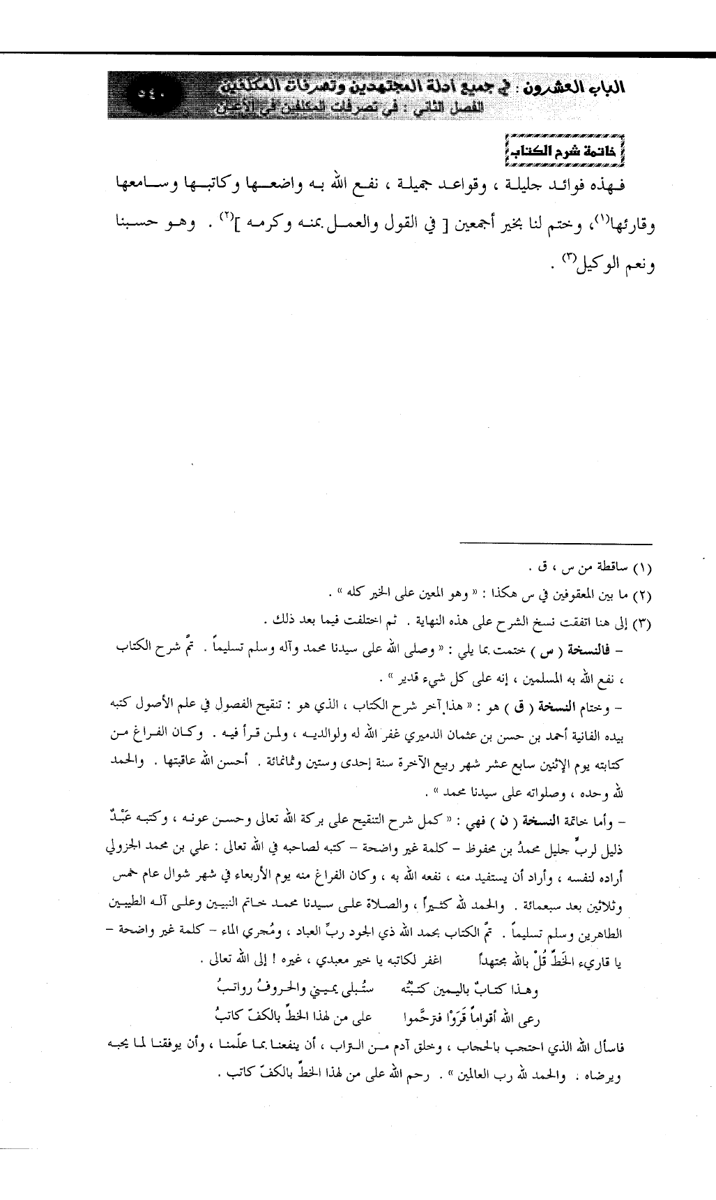 - فالنسخة (س) ختمت بما يلي: ((وصلى الله على سيدنا محمد وآله وسلم تسليماً. تمَّ شرح الكتاب، نفع الله به المسلمين، إنه على كل شيء قدير)) .